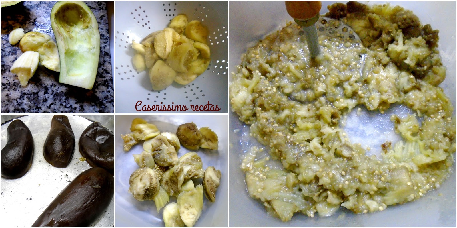 Ante todo lavamos las berenjenas, las cortamos al medio, las ahuecamos con una cuchara, por partes y con cuidado. Volvemos a colocar la pulpa dentro bien acomodada y las colocamos boca abajo en una fuente de horno con un centímetro de agua. Las llevamos a horno medio hasta que estén tiernas. Las dejamos en un plato o en la misma fuente boca abajo pero retiramos las pulas que pondremos en un colador para escurrir el líquido. Una vez escurrido bien, bien, hacemos un puré y reservamos.