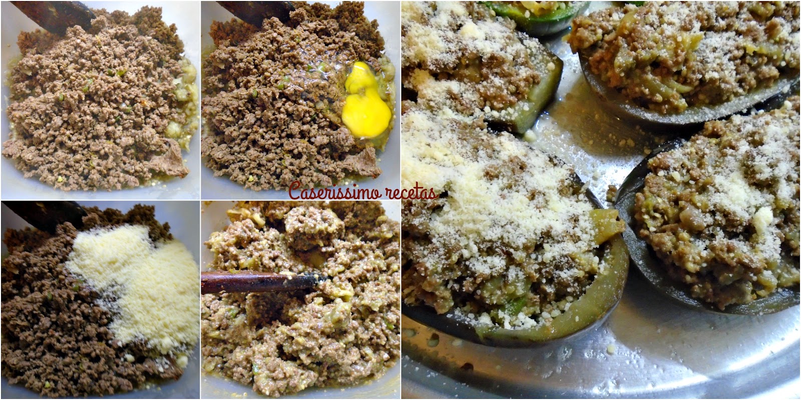 Retirar del fuego. Incorporar un huevo batido,  50 gramos de queso rallado y 2 cucharadas de pan rallado. Agregar la pulpa de las berenjenas reservada.  Rellenar las berenjenas y espolvorearlas con queso rallado. Llevar a horno medio hasta que gratinen.
