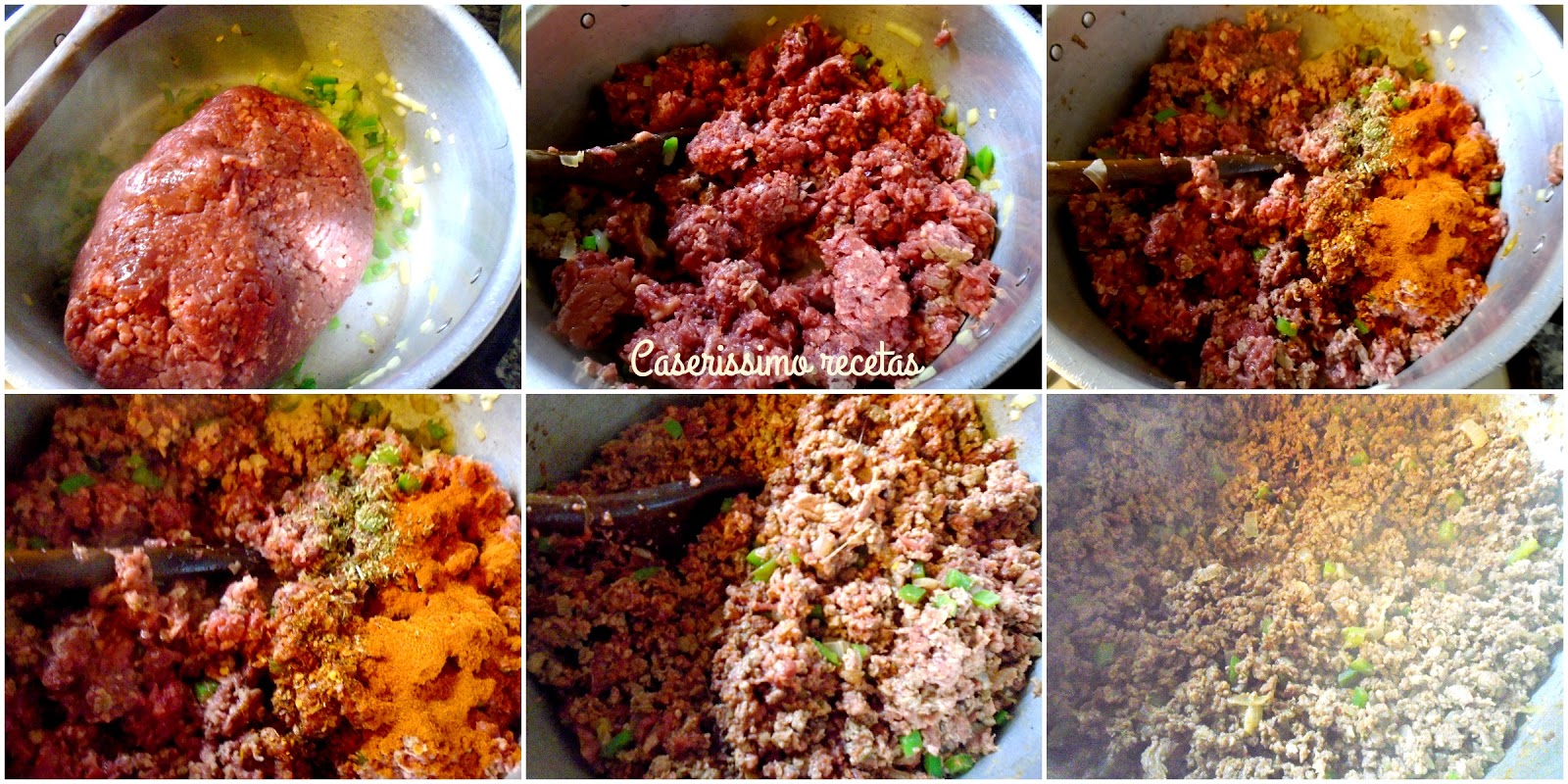 Una vez que comienza a brillar y estar mas tiernito, agregar la carne picada. Revolver con un tenedor evitando que se hagan grumos en la carne, separarla bien. Una vez que esté marroncita le agregamos el pimentón, el orégano y la albahaca, sal y pimienta a gusto. Revolvemos bien y dejamos cocinar a fuego bajo hasta que esté cocida. Controlar que tenga jugo siempre, si no agregar un poco de agua caliente, poco, medio vasito por ejemplo.