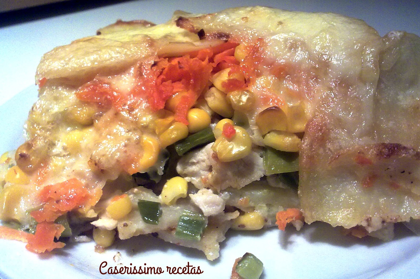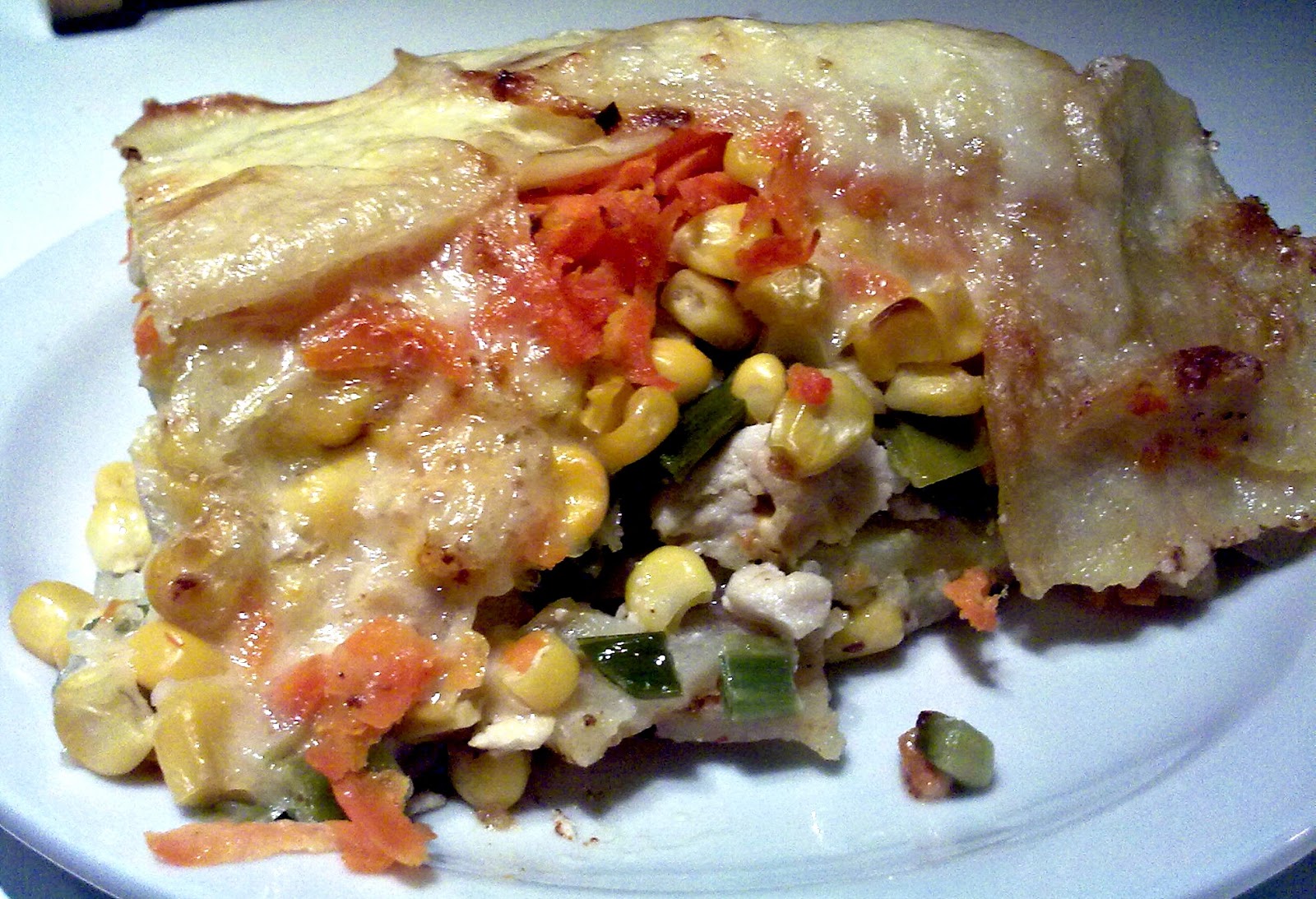 *Ahora colocamos una capa de pollo, luego los puerros, salamos, colocamos los granos de choclo y luego las zanahorias ralladas. Otra capa de papas untadas por un solo lado con queso crema, esta vez con la cara untada hacia abajo, de modo tal que tanto la capa inferior, como la superior quede con el queso hacia el relleno. Luego otra capa de queso rallado y otra capa de papas. Rociamos todo con crema de leche y llevamos a horno medio a fuerte durante 20 minutos (depende del horno).