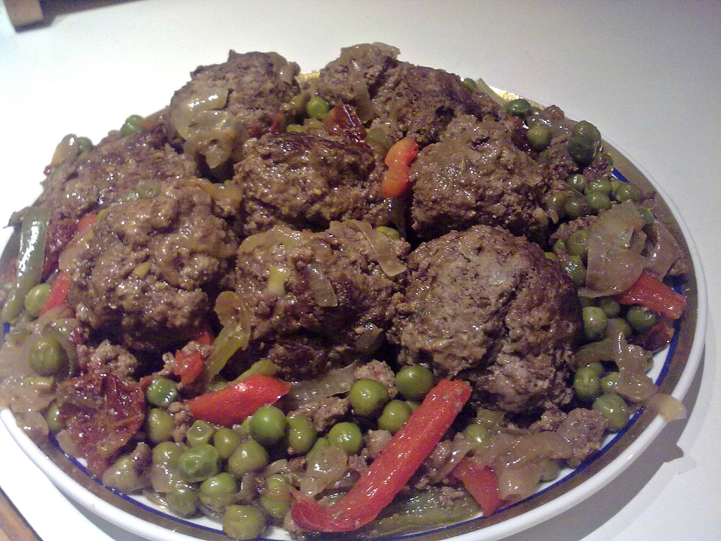 tomates secos  7 u 8 - cebollas 2 - morrón rojo 1 - ajo 1 diente -  carne picada 1 y 1/2 kilo - huevo 1 - pan rallado 2 cucharadas soperas - sal a gusto - savia deshidratada 1/2 cucharadita - perejil deshidratado 1 y 1/2 cucharada sopera - salsa bien grande o Inglesa 1 cucharada sopera - aceite cantidad necesaria - pimentón dulce 1 cucharadita - arvejas congeladas un paquete de 400 gramos - salsa de soja 50 cc -