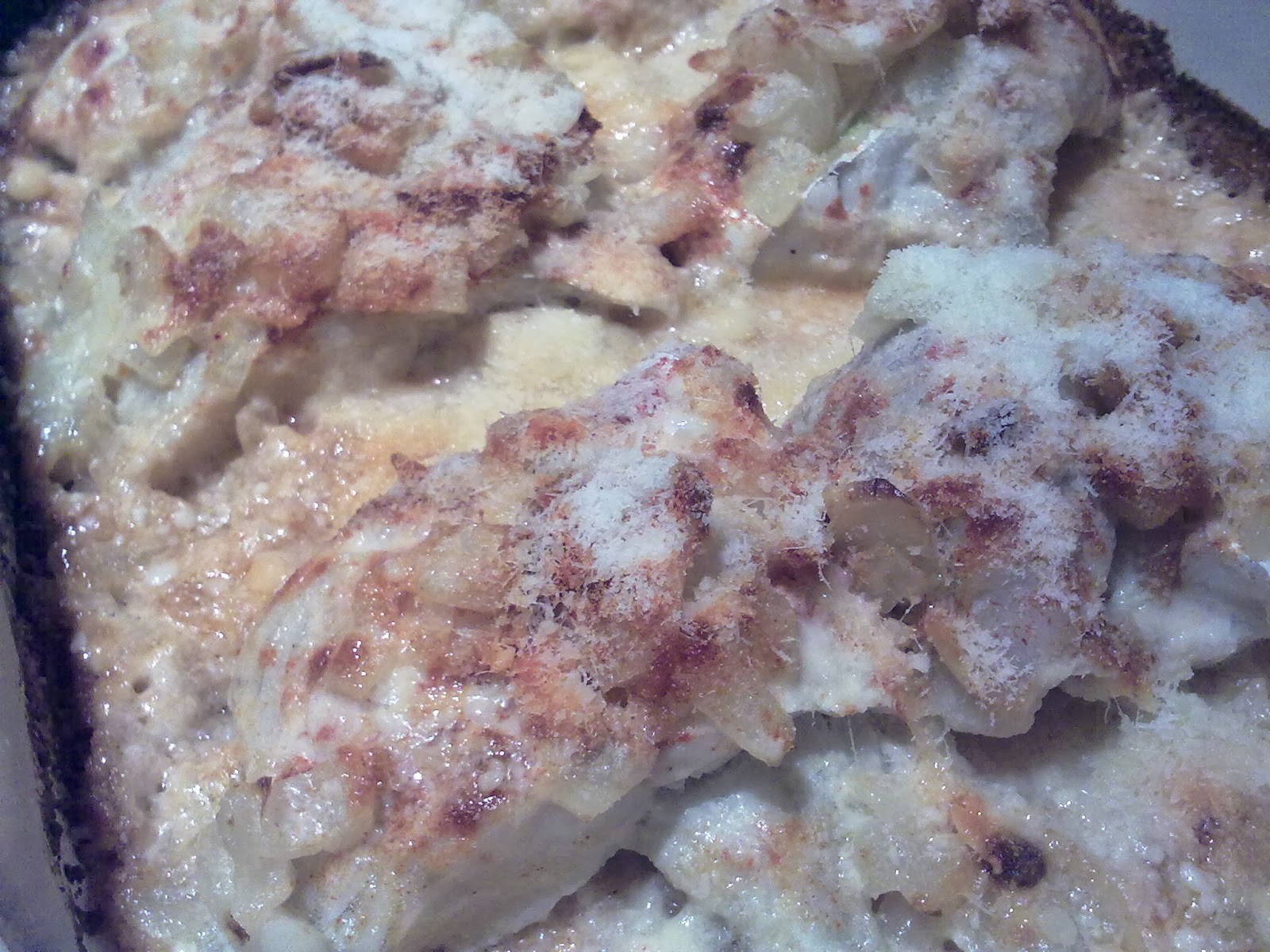 Pelar y cortar en láminas de 1/2 cm un kilo de papas. Hervirlas en caldo (cubito) pero sin que se cocinen del todo, cuando les falta aún, las cuelan. Terminan de cocinarse en el horno.
