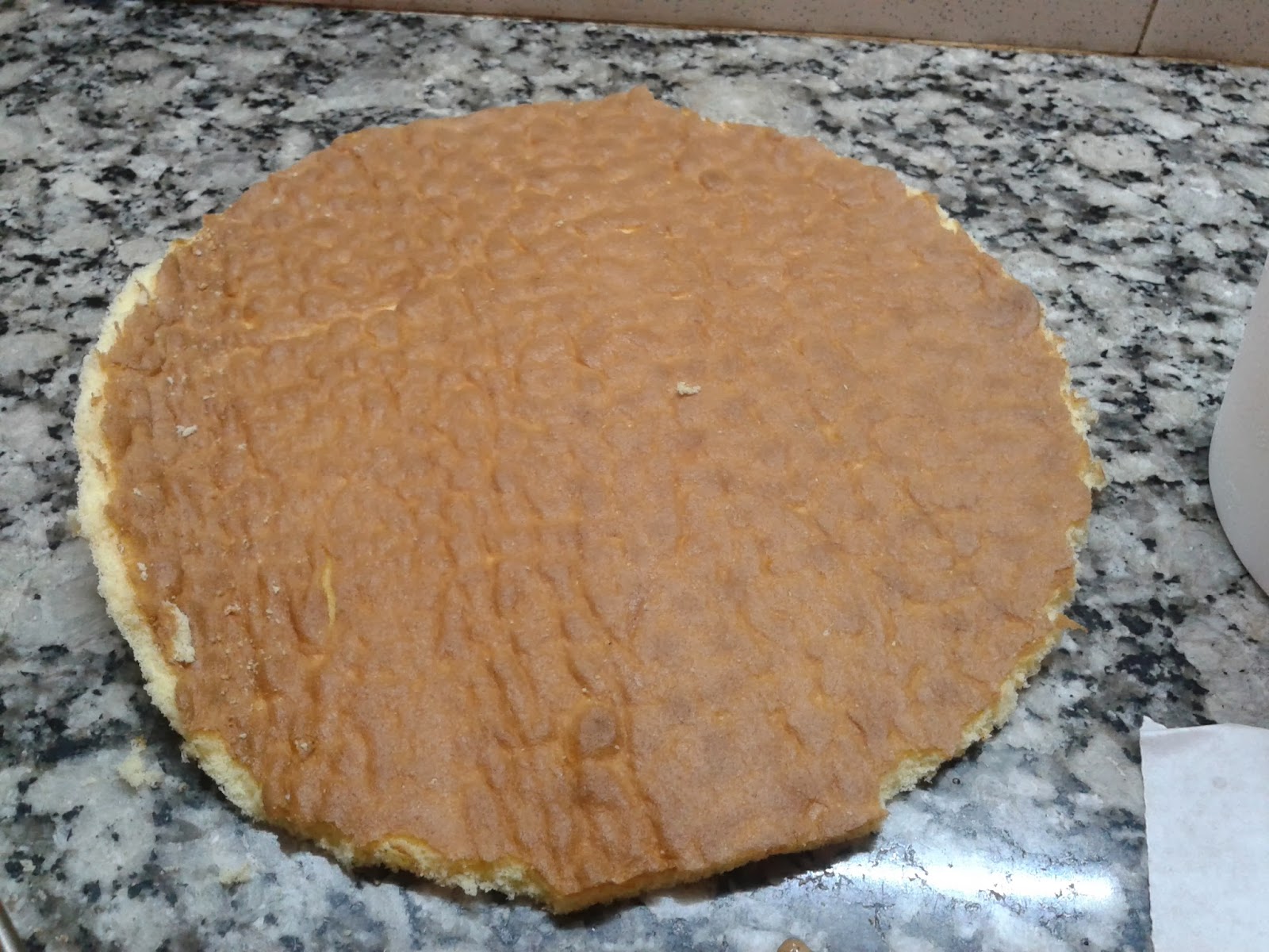 Cortar dos discos de pionono del tamaño del molde que vamos a usar. Simplemente apoyando la base y con cuidado con un cuchillo o la mano, le cortamos el excedente y listo.