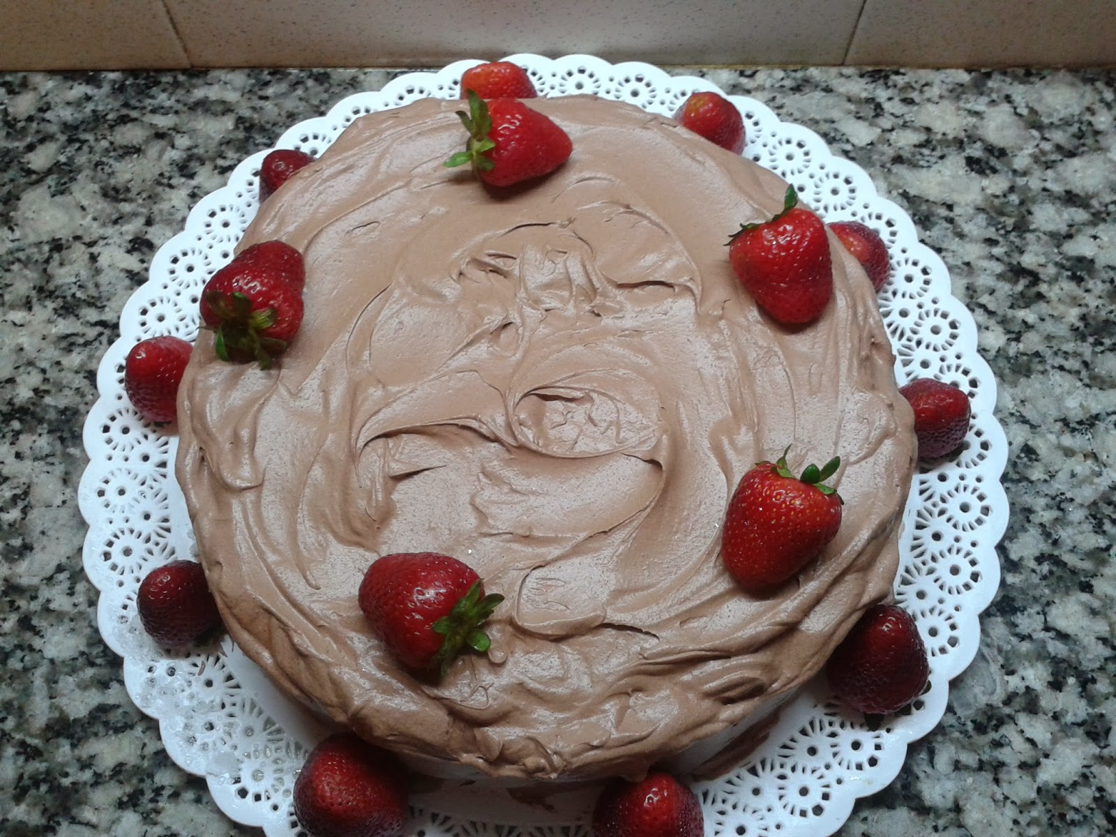 Retiramos la torta del freezer, desmoldamos invirtiendo, sacamos el aro del molde y luego con cuidado el film o acetato.Cubrimos con la ayuda de una espátula o cuchara toda la superficie y laterales. Decoramos con frutillas bien lavaditas o lo que gusten. Glup!