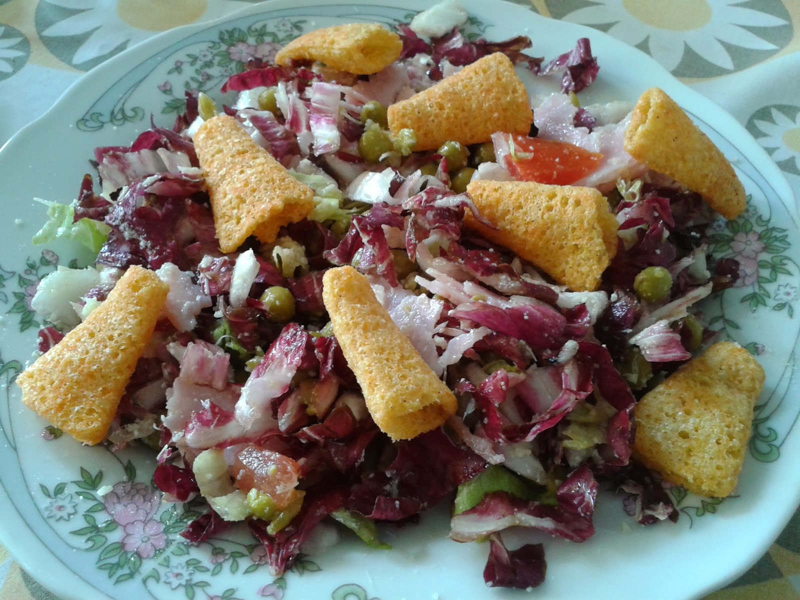 Luego sumé dos radichios chicos y tiernitos cortados en juliana. 100 gramos de lomito ahumado en trocitos, previo feteado fino. 50 gramos o un poco mas de queso rallado del bueno. Una lata de arvejas frescas (no las que dicen secas remojadas) o congeladas, cocidas y frías.