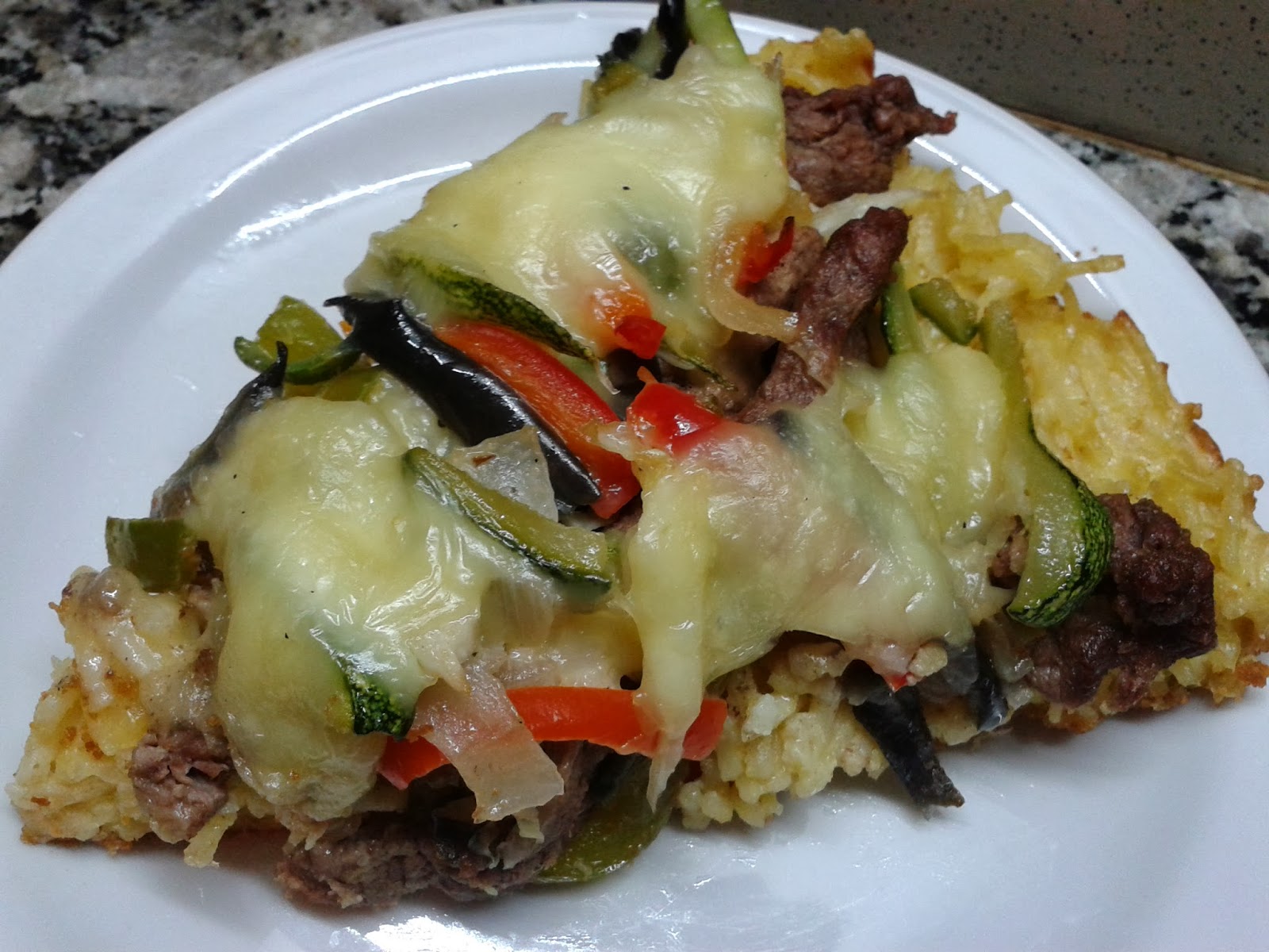 Tal como hice la anterior Pizza de pollo y vegetales, ahora traigo esta de carne que es un plato completo y les aseguro que con una porción normal del tamaño de la pizza común (de una pizzera de 32 cms. salen 8 porciones como una pizza grande) quedan muy satisfechos.