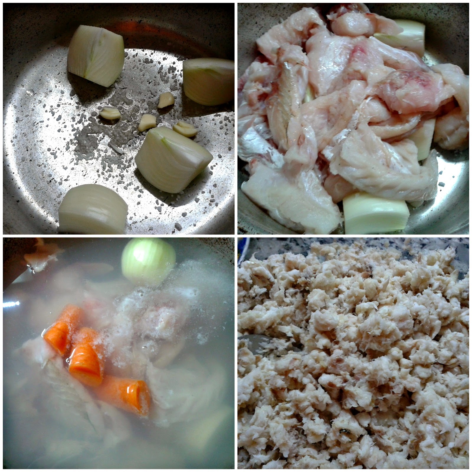 Dejamos enfriar un poco y colamos. Retiramos las cebollas y las zanahorias y desmenuzamos las merluzas y los dientes de ajo. Nos aseguramos que no hayan espinas ni huesitos.