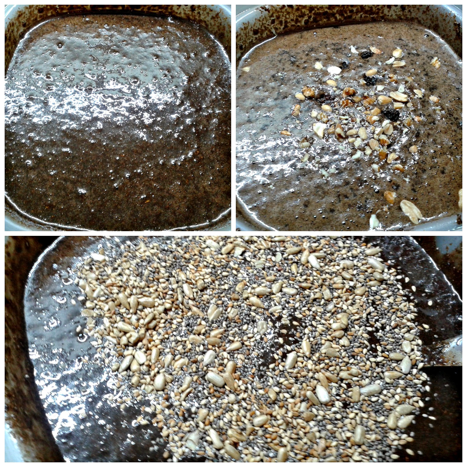 Agregamos los frutos secos (nueces, almendras, castañas de cajú y también pasas de uva si les gusta) y las semillas (pusimos girasol y sésamo tostados y chía natural, era un mix muy rico). Mezclamos todo y volcamos en una budinera mediana y en otra grande, previamente aceitadas y enharinadas. Si hacen la mitad de la receta usen una budinera normal, mediana.