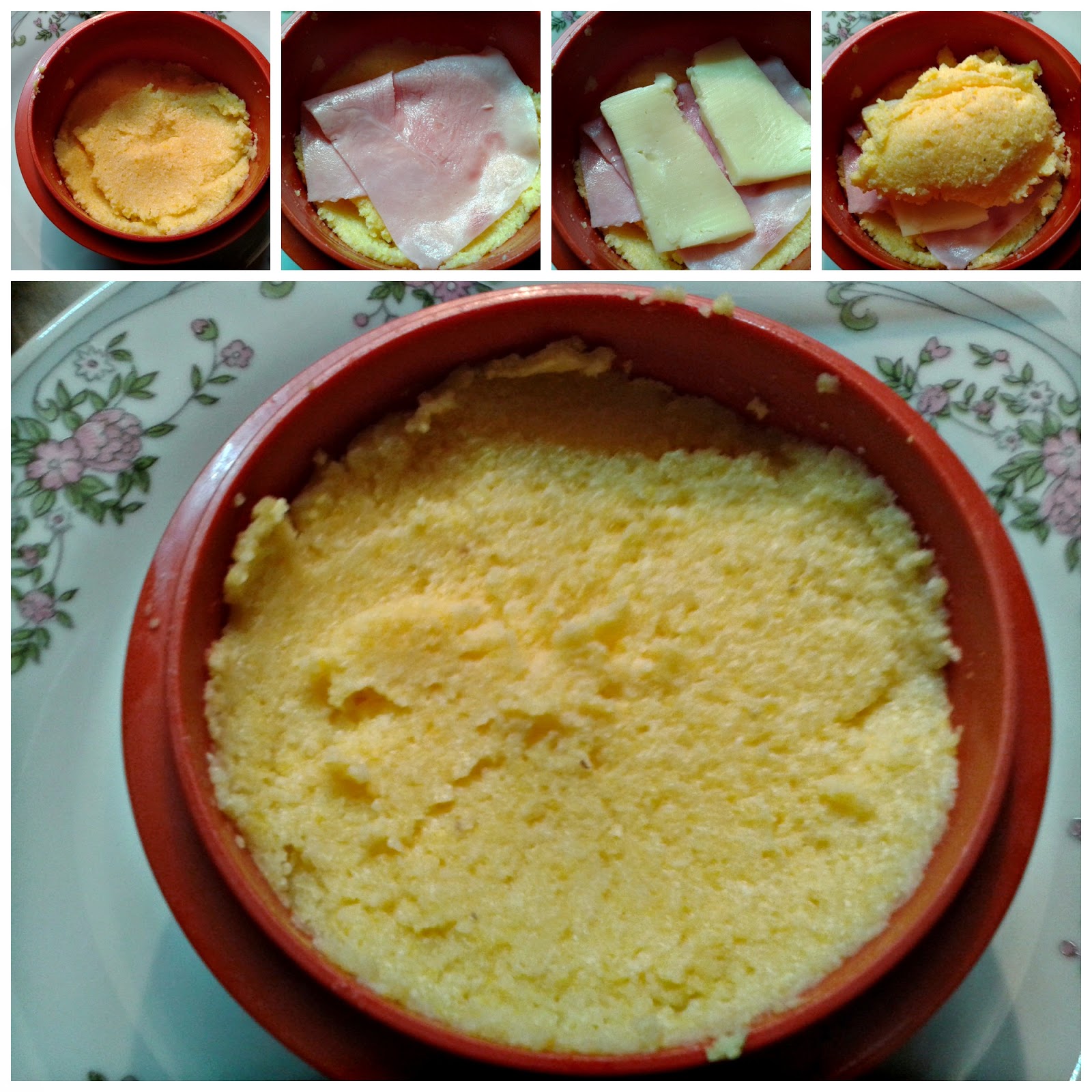 Tomen un aro de emplatar (yo tengo el hamburguesero de Tupperware y es el que uso) y colóquenlo en un plato para servir o en una fuente para horno (esto si prefieren calentar todas las porciones en el horno, yo preferí ir sirviendo y calentando apenas en la microondas). Coloque una capa de 1 cm de polenta y presionen bien para que se aplane y comprima. A continuación coloquen una feta de jamón cocido doblada al medio y una feta de 1/2 cm de mozzarella. Agreguen otra parte de polenta y vuelvan a presionar bien.