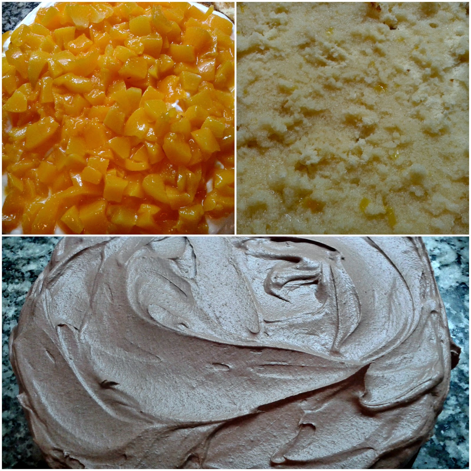 Sobre la crema colocar los duraznos picaditos sin llegar al borde de la crema (esto es para que no desborden los ingredientes al armar toda la torta).