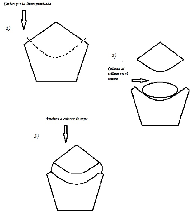 Les iba a hacer un glaseado de mandarinas también, como le hice al budín y caí en la cuenta de que no tenía azúcar impalpable (o glas) así que todos hicimos un gran esfuerzo y nos las comimos con dulce de leche. Simplemente les saqué la tapita haciendo un cono invertido, le puse dulce de leche, un buen copete, y le puse la tapa otra vez. Lo hice con un cuchillo fino y de punta perforando desde arriba de la madalena hacia el centro y formé un cono. No tomé fotos de eso, pero les dejo un esquema para graficar bien el modo en que lo hice.