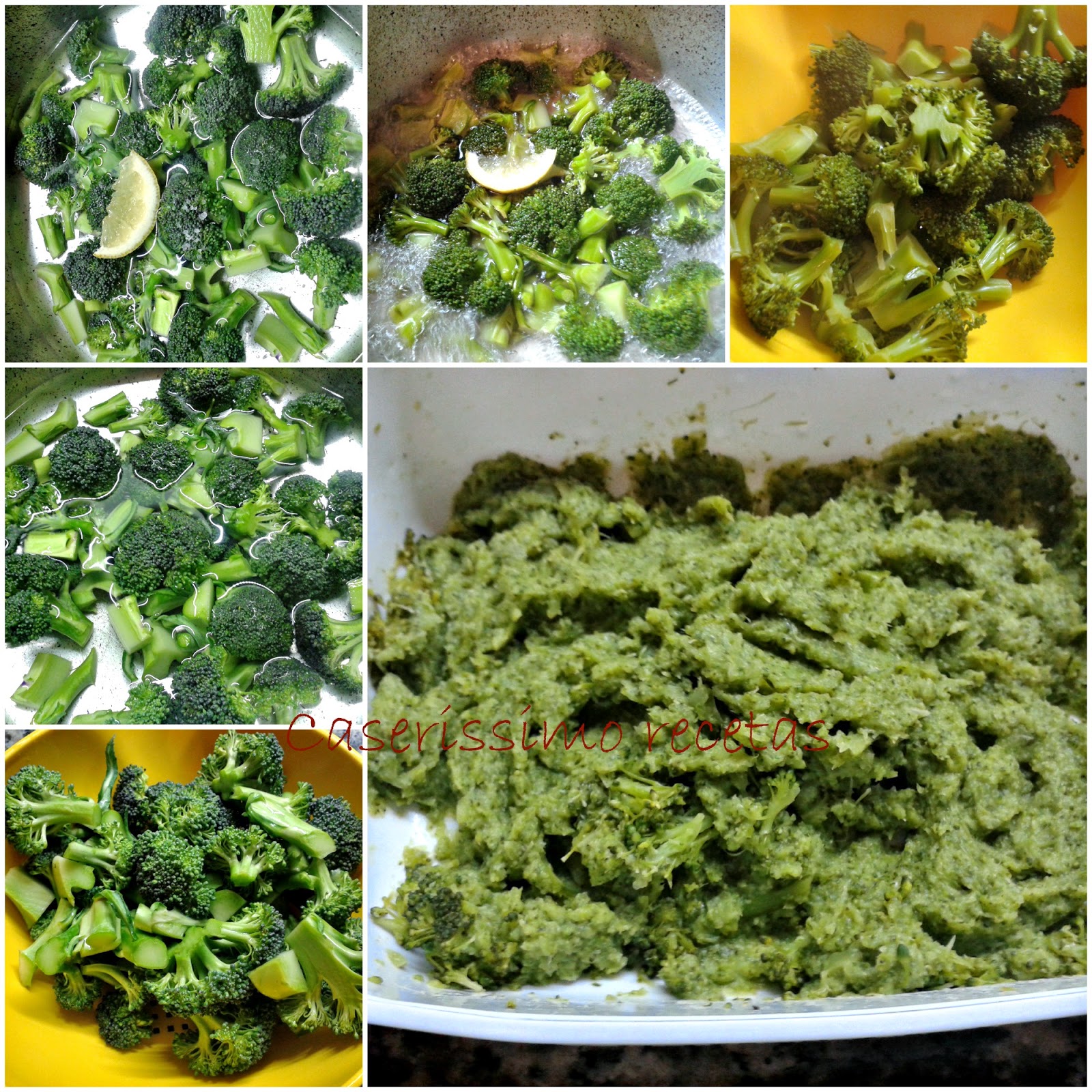 Lavé el brócoli y lo puse con un poco de agua, sal y limón en una cacerola a fuego casi máximo, tapado, al hervir lo dejé diez minutos. Probé que estuviera tierno pinchando con la punta de un cuchillo en los tallos mas gruesos y lo colé inmediatamente. Con el mixer lo trituré bien. Reservé.