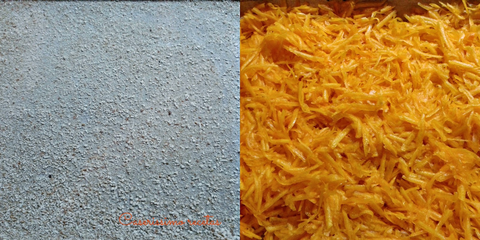 La calabaza en un bol,(mediana, unos 400 a 500 gramos), rallada con la parte gruesa del rallador, en crudo, eh? Reservar.