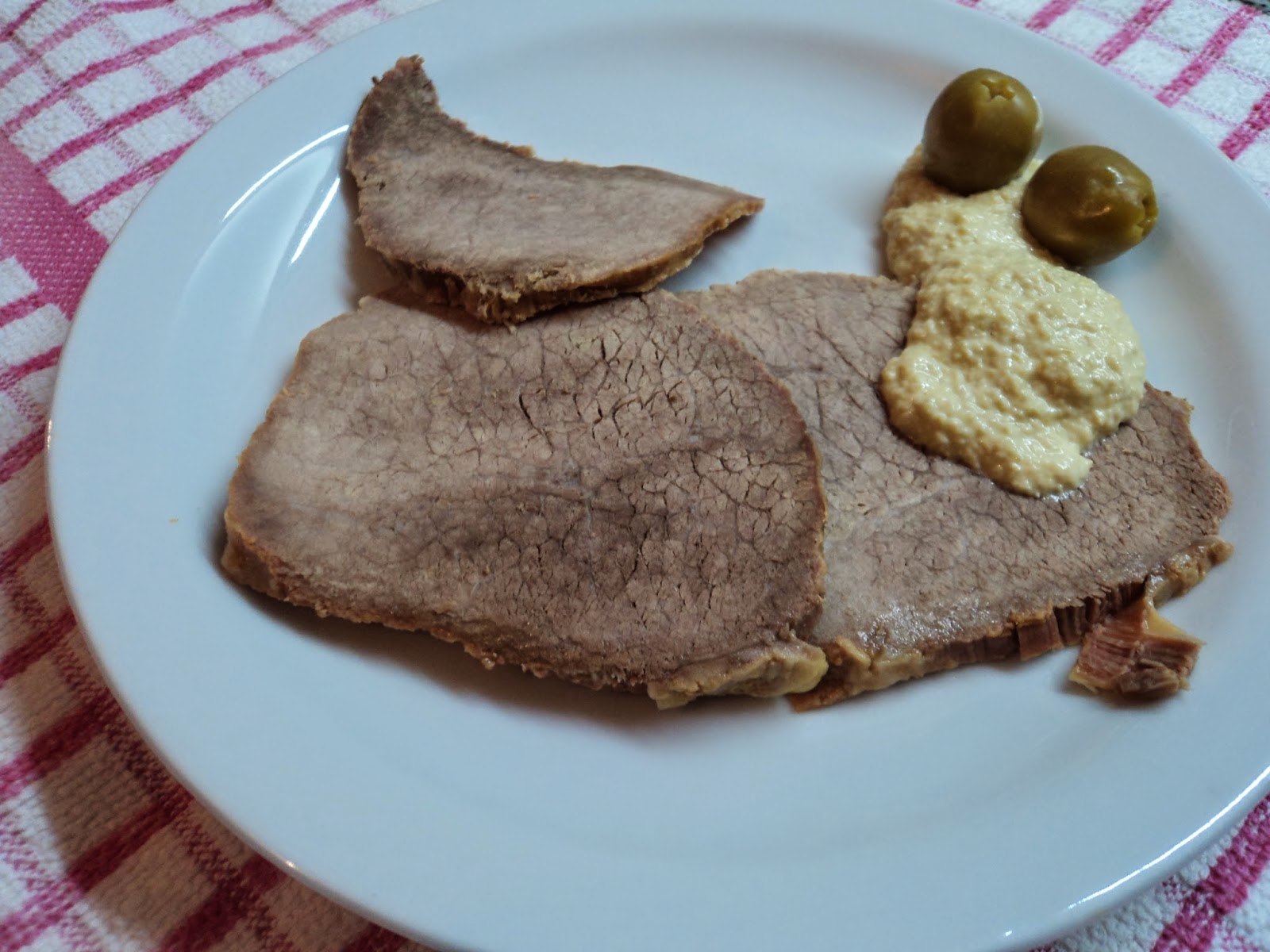 Lo dejan enfriar en su propio caldo al que deberán agregar agua si ven que se consume mucho, mientras que hierve, y agua caliente para no cortar el hervor. Una vez frío, lo cortan en rebanadas o fetas bien finas al estilo lengua a la vinagreta o vitel toné y lo colocan en una fuente plana, lo cubren con film y lo llevan a la heladera.