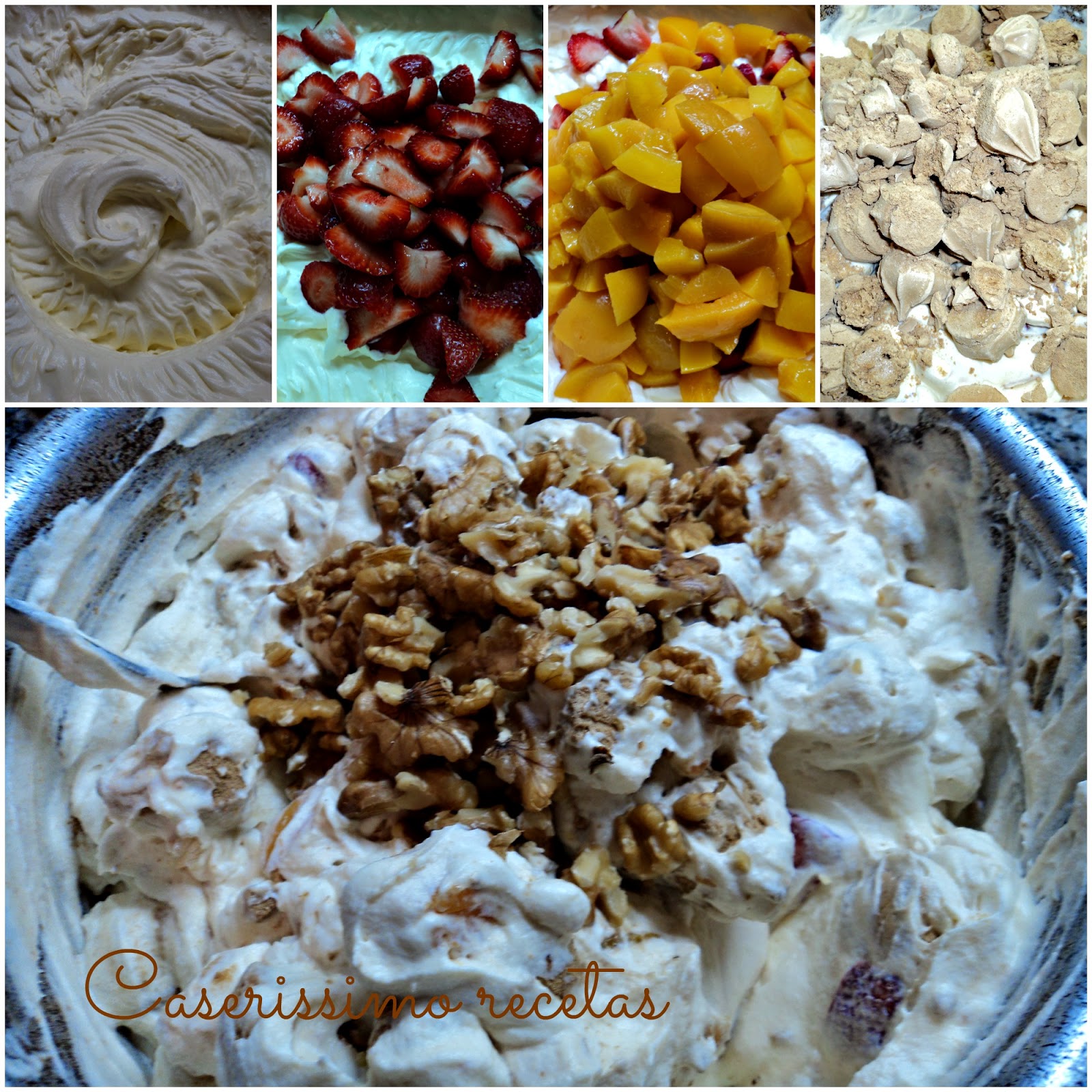 Ahora incorporamos las frutillas, los duraznos, los merenguitos y las nueces u otra fruta seca que hayamos elegido. Mezclamos suavemente hasta integrar. Reservamos.