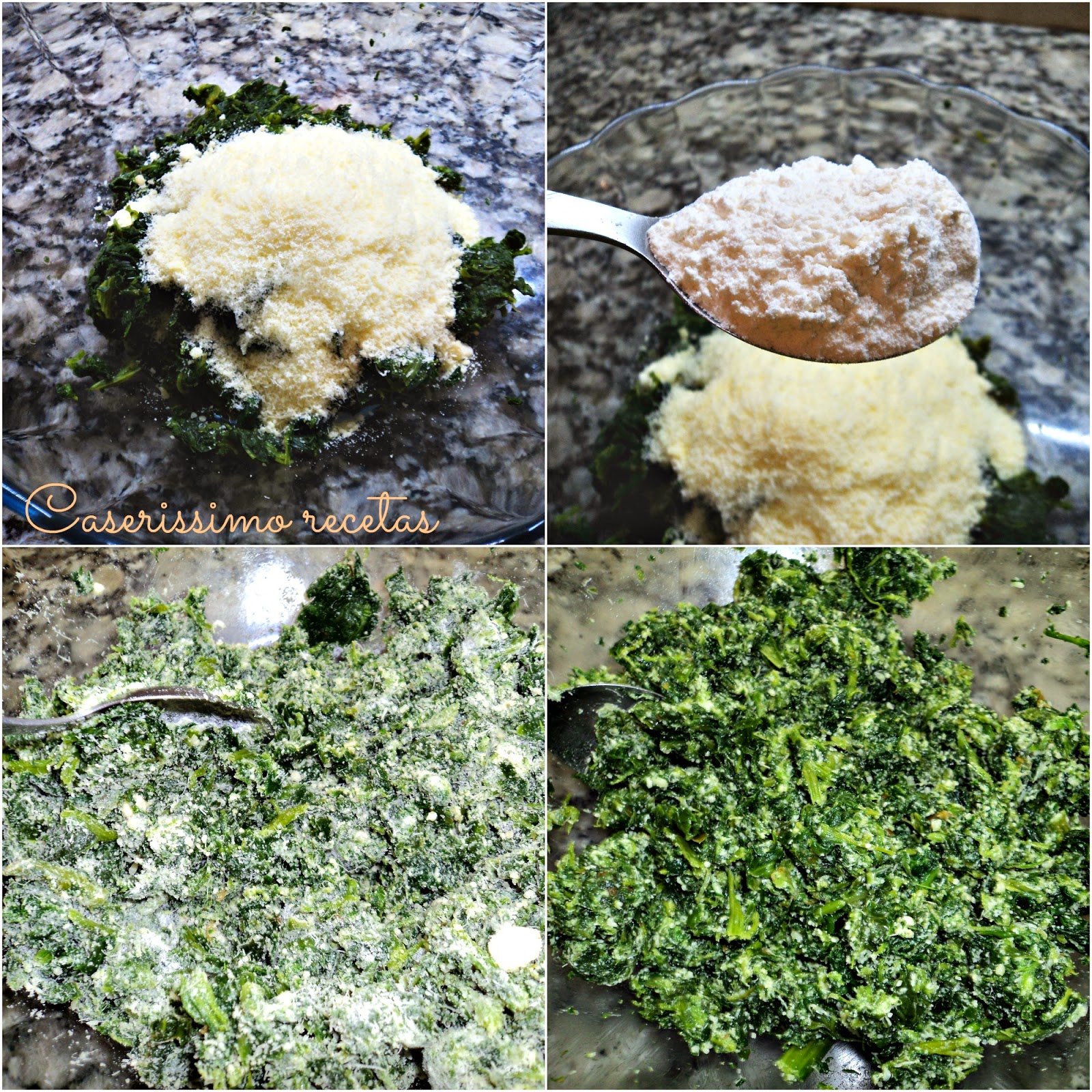 A la espinaca cocida y escurrida le agregué el queso rallado, la harina y sal a gusto. Mezclé bien y rellené.