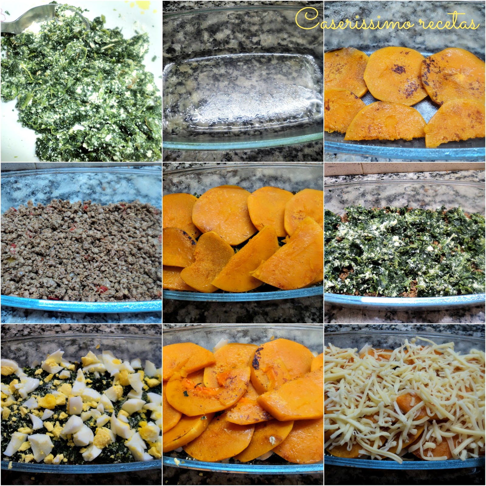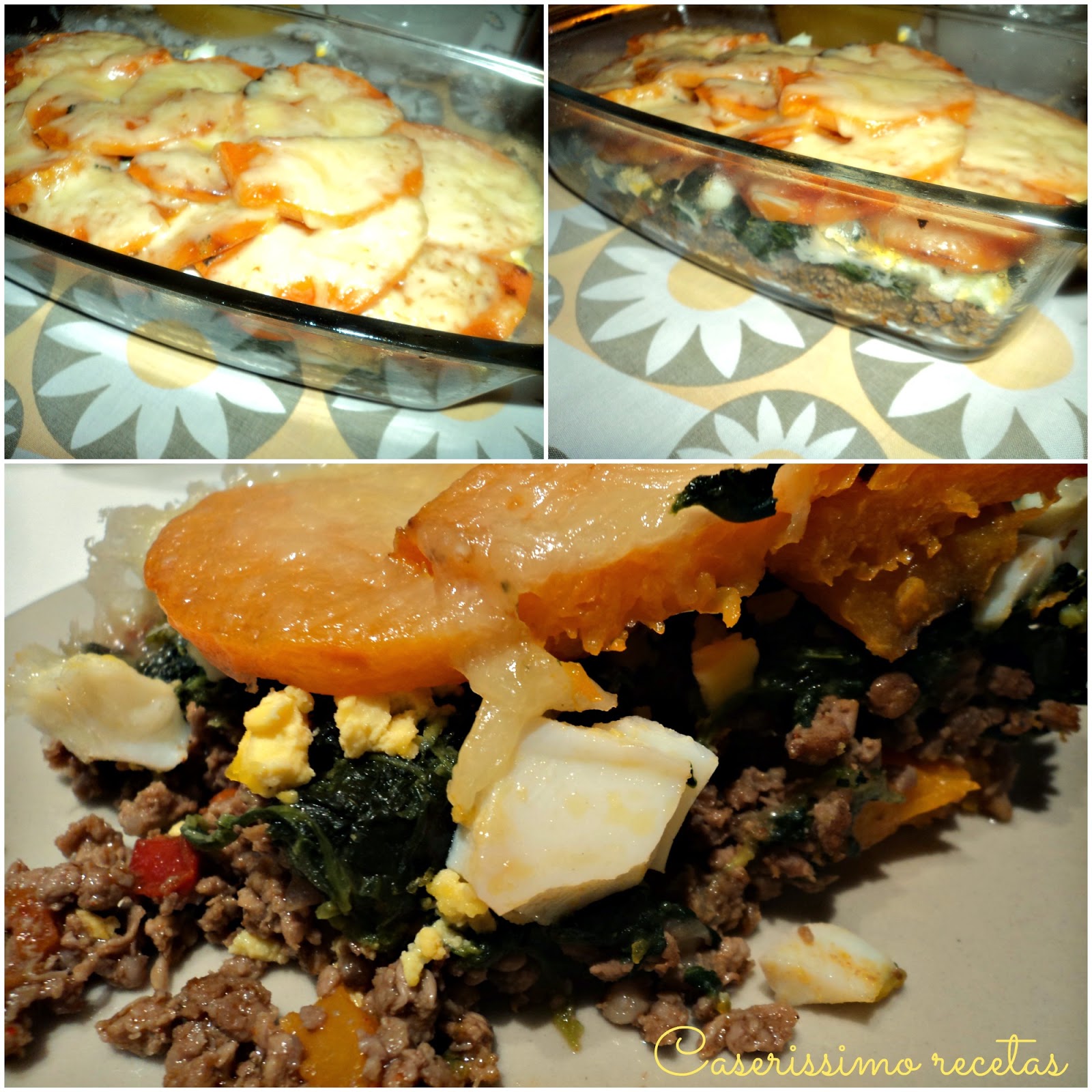 Ahora ponemos la espinaca, luego el huevo duro y otra capa de calabaza.