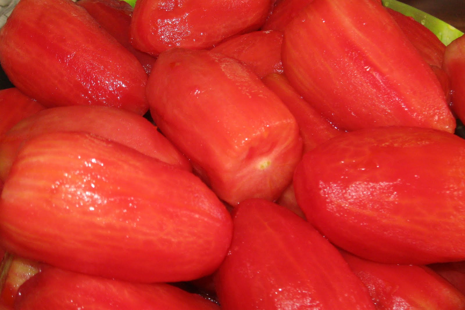 • 1 y 1/4  kilo de tomates perita frescos, maduros pero no demasiado blandos o 4 latas de tomates perita pelados (NO TRITURADOS, ENTEROS)