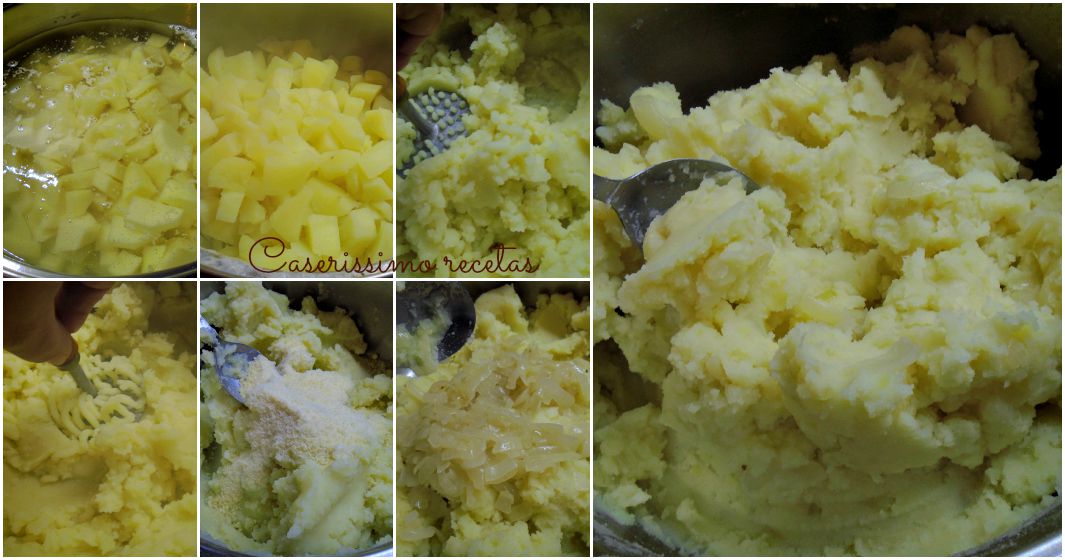 Mientras tanto preparamos el puré. Cortamos chico las papas y las ponemos en una cacerola con agua y un poco de sal. Dejamos que hiervan 30 minutos a partir de agua fría y probamos si están listas. Colamos y hacemos el puré. Rectificamos sal y agregamos pimienta negra de molinillo o en su defecto blanca molida.. Removemos bien y dejamos enfriar.