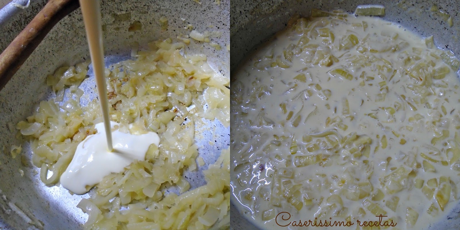 Esta la hacemos dejando un poco mas la cebolla que se caramelice y cuando se pone mas marroncita le añadimos la crema de leche, sal y pimienta a gusto. Reservamos.