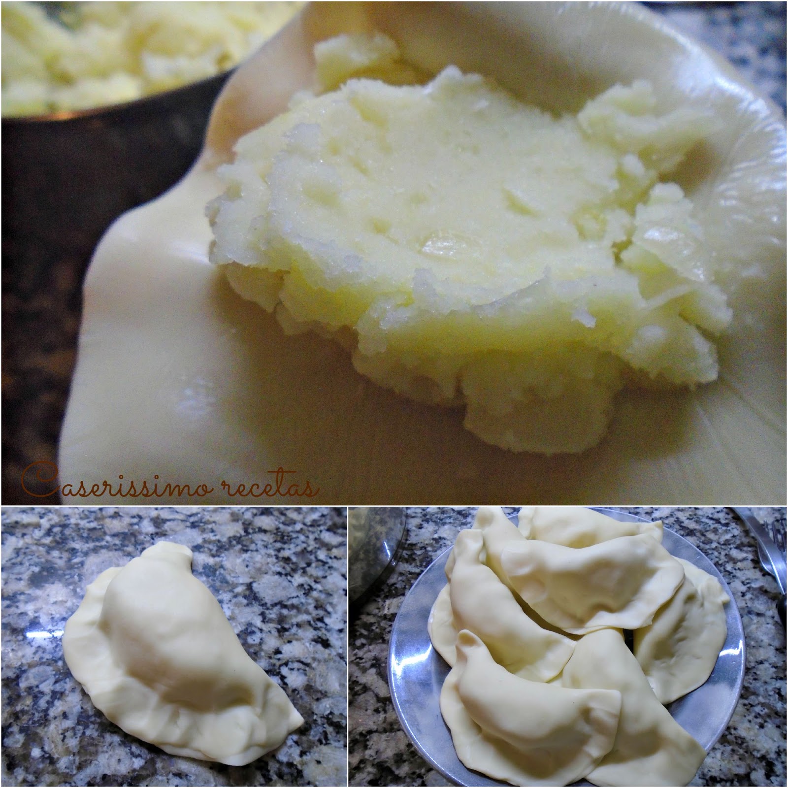 Una vez obtenido el puré vamos rellenando cada disco de masa con una cucharada de relleno (de las grandes) mojamos los bordes y sellamos bien apretando con los dedos, como se ve en las fotos. Debe quedar como una empanada pero sin repulgar.