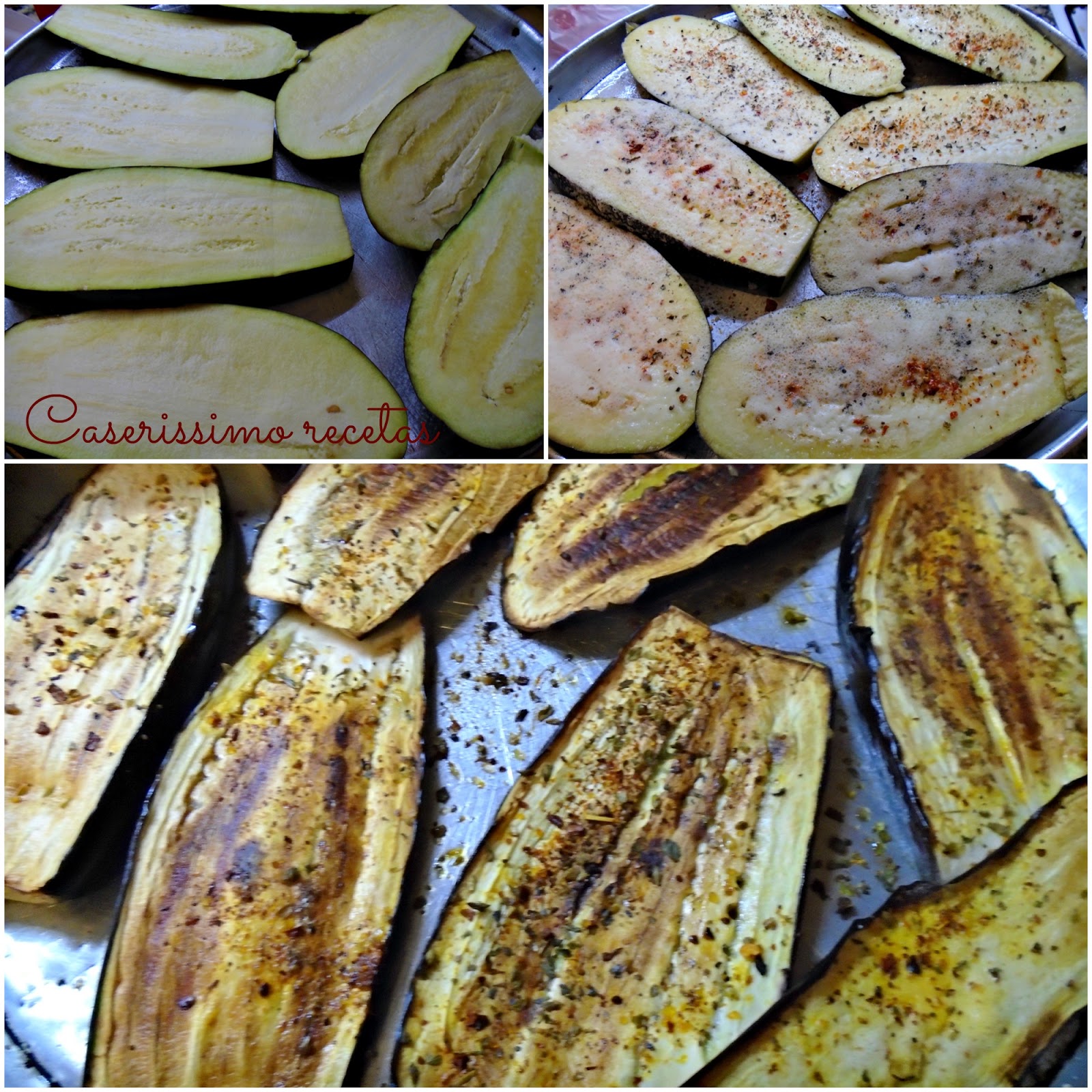 Colocar las berenjenas sin encimar. (No hace falta ponerlas con sal gruesa en un colador, pero si no quieren que sean amargas, cómprenlas bien firmes, sin arrugas ni estando blandas y con sus cálices verdes y espinosos, bien turgentes.)