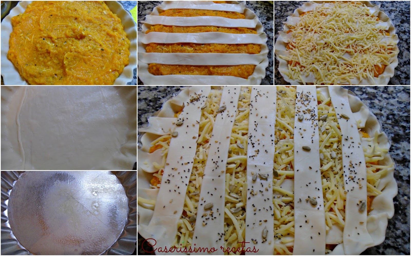 Volcamos el relleno de calabaza y cortamos tiras gruesas, de 1 y 1/2 a 2 cms. y colocamos dejando un espacio entre medio de cada tira en un mismo sentido.