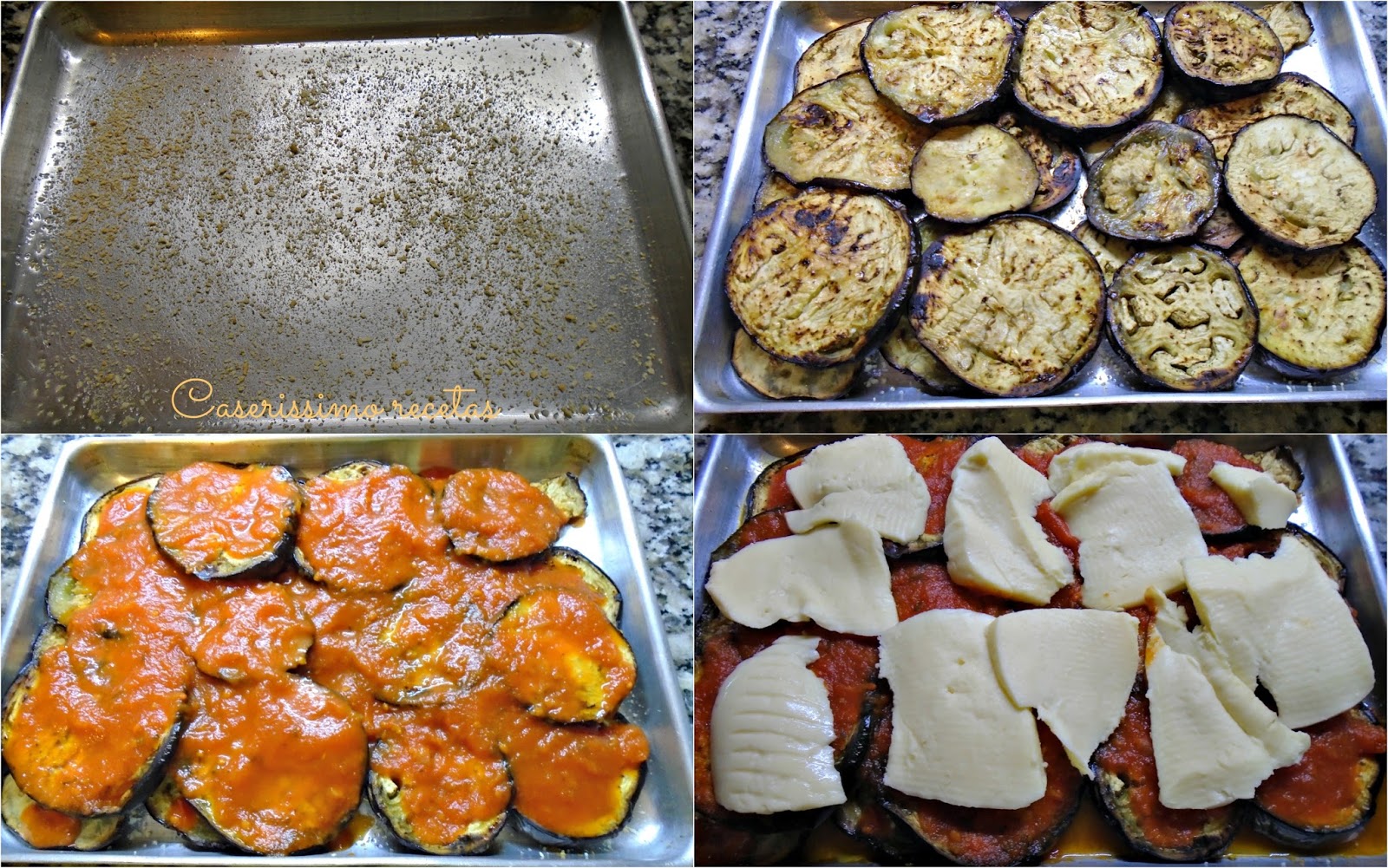 Vamos poniendo en un plato o directamente en una fuente de horno un poco profunda (rociada con rocío vegetal) y vamos formando 3 capas de berenjenas.