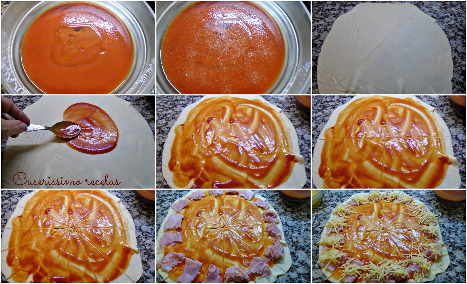 Sugerencias: se puede poner huevo duro, morrones de lata u horneados, cebolla rehogada, aceitunas picaditas, roquefort, etc, en lugar de jamón.