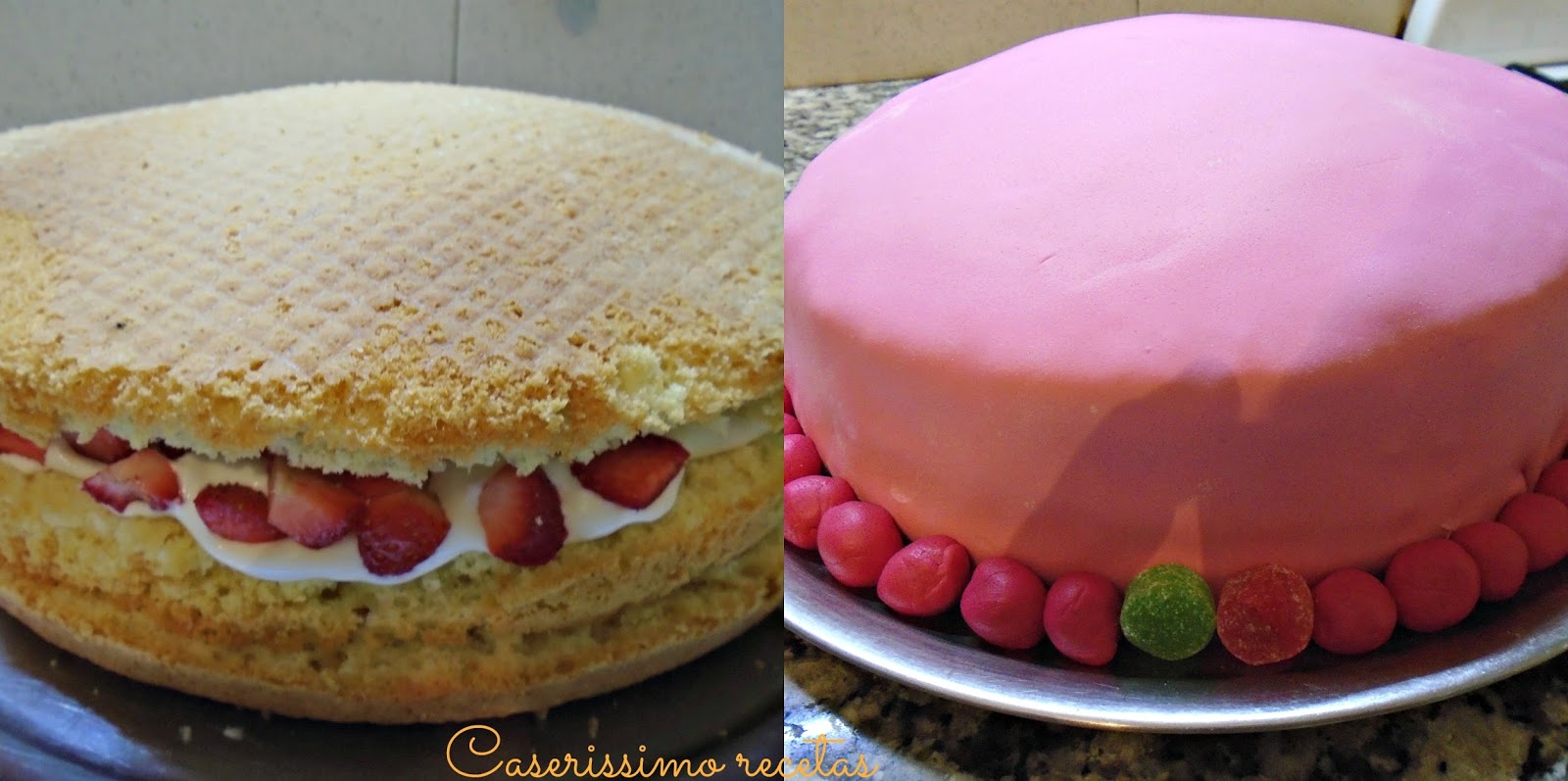 Colocamos la base del bizcochuelo bien centrado y embebemos con leche (o el jugo de las frutillas diluido como expliqué anteriormente, en caso de haber usado azúcar). Vean de humedecer llegando incluso un poco a los bordes para que al comerla, no esté seca.