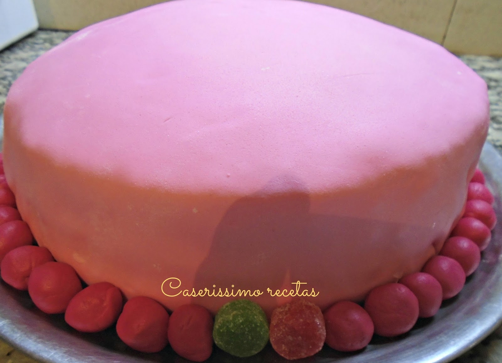 Estiramos el fondant ya coloreado sobre la mesada con palote, y para estirarlo usamos azúcar impalpable. Estiremos bien finito. Enrollamos en el palote y colocamos sobre el centro de la torta. Con cuidado estiramos bien y prolijamos la superficie y los bordes. Con un cuchillo sin dientes cortamos el sobrante. Con el sobrante, en mi caso, agregando mas colorante, formé bolitas y decoré. Como quería destacar el frente, puse unas gomitas de colores (gominolas).
