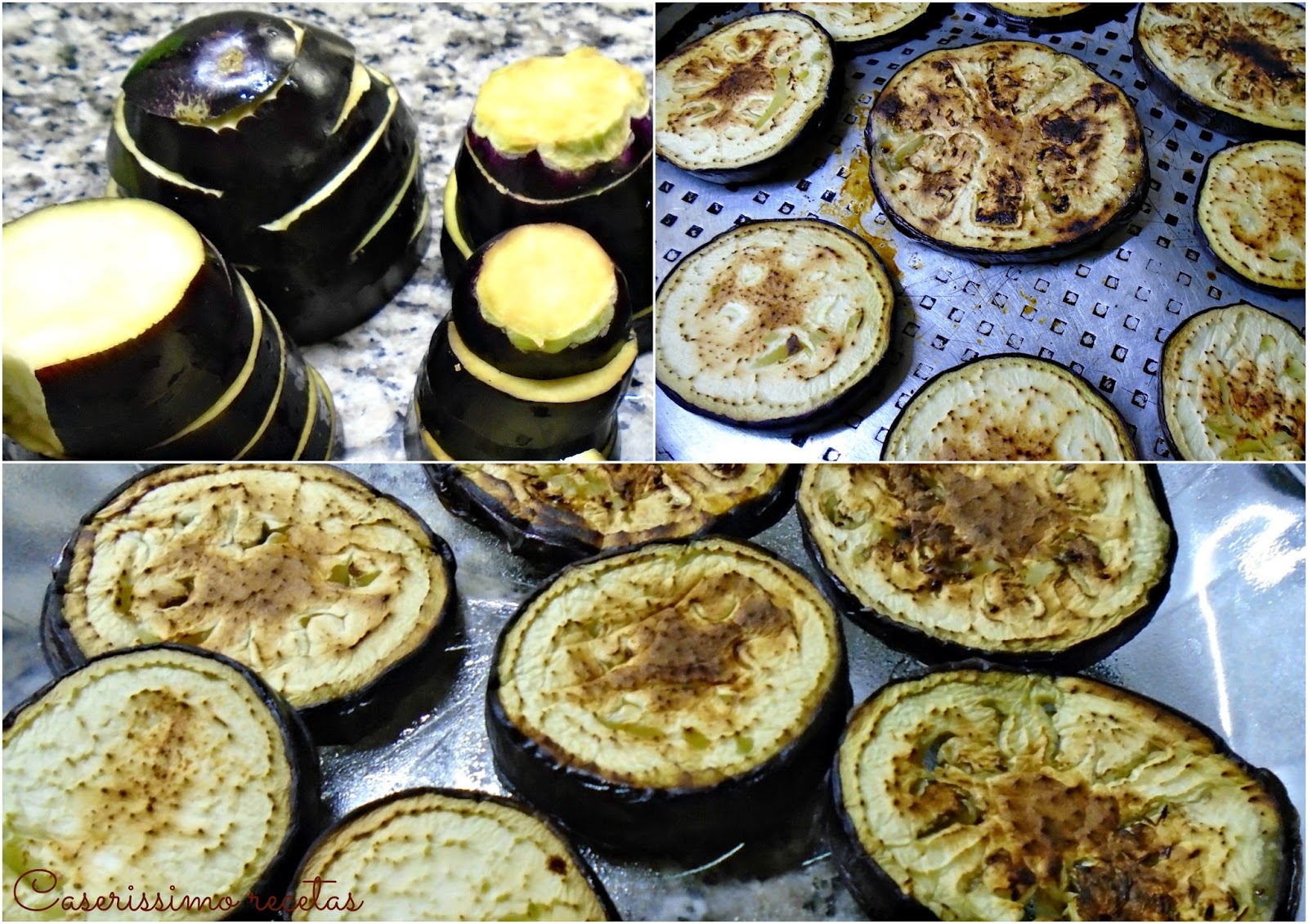 Cortamos en rodajas a lo ancho las berenjenas. Las grillamos en una plancha o sartén con un poco de rocío vegetal para que no se peguen. De ambos lados y hasta que estén doradas y casi tiernas.