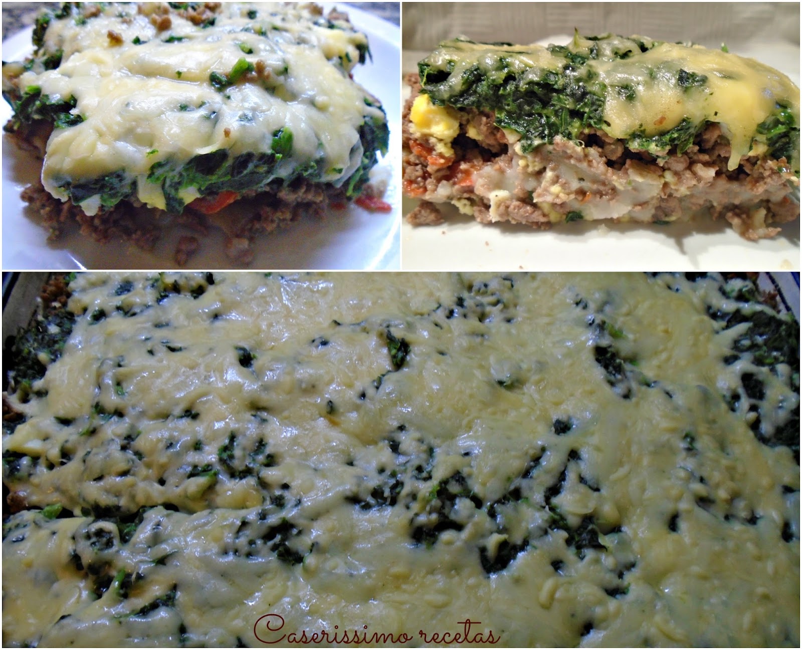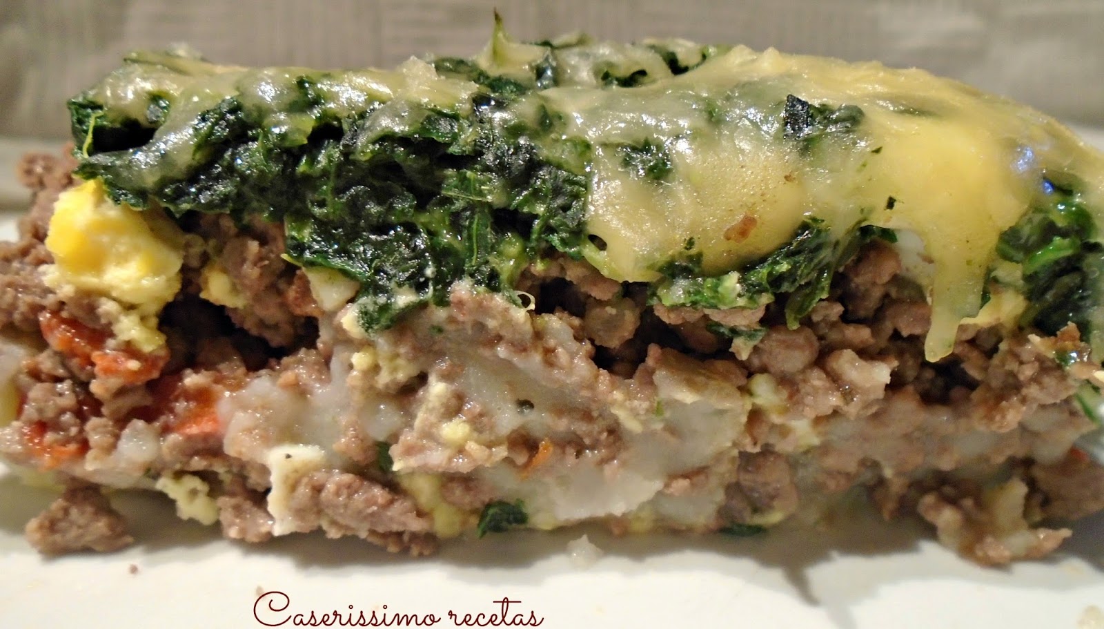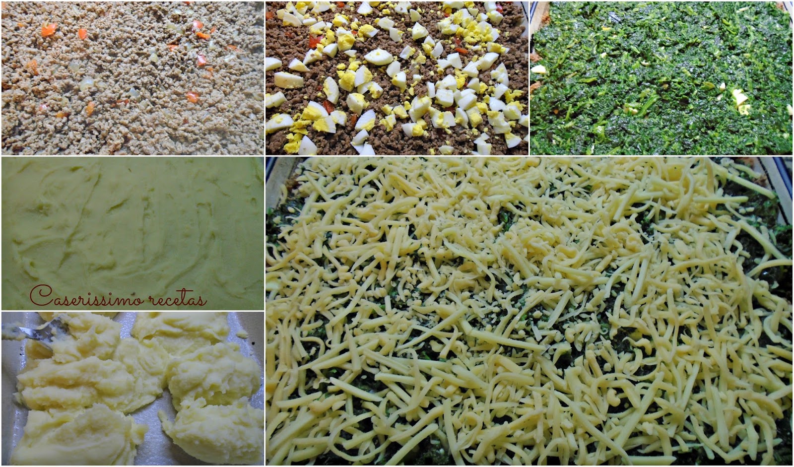 Luego ponemos la carne y cubrimos todo el puré. Esparcimos sobre ella los huevos picaditos. Sobre los huevos las espinacas y sobre la espinaca el queso en hebras. Llevamos a horno bien fuerte hasta dorar. Retiramos.
