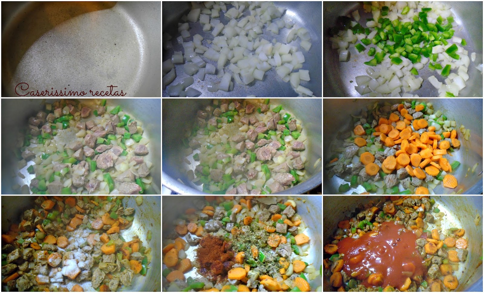 Ponemos rocío vegetal en una cacerola grandecita. Picamos la cebolla y la rehogamos a fuego bajito unos 5 minutos, añadimos el azúcar y removemos bien. Agregamos el morrón picadito y removemos. Luego ponemos la carne cortada cortada en cubos chicos y dejamos que tome color. Ahora incorporamos las zanahorias en rodajitas finas.