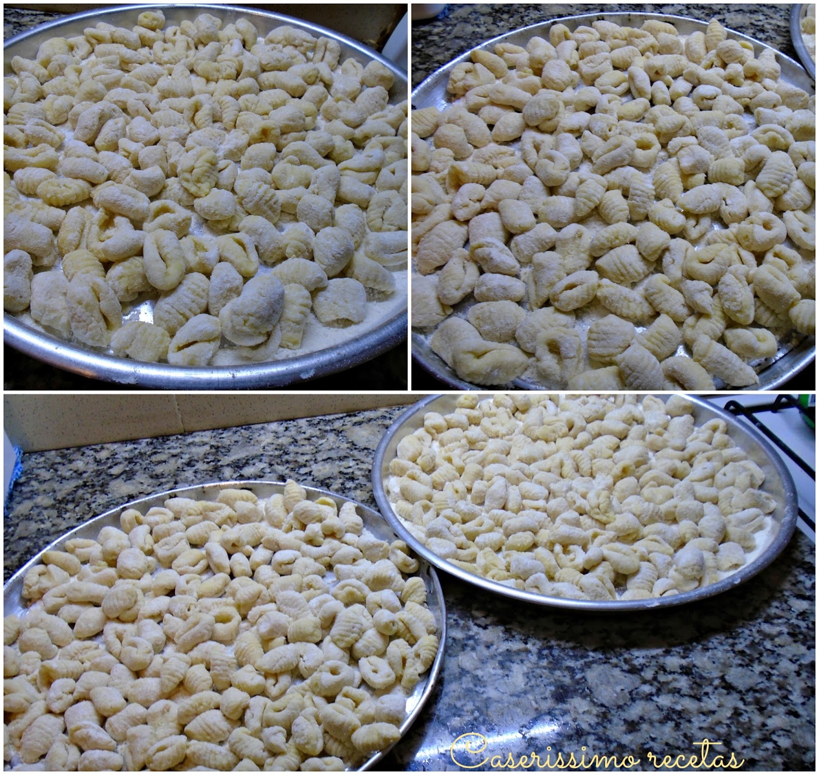 A medida que vamos teniendo los ñoquis, los podemos pasar por un tenedor o una ñoquera enharinada haciendo una leve presión al hacerlos rodar para que quede una especie de caracolito con hueco en medio y rayado en su exterior.