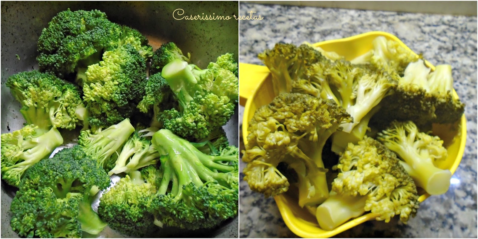 Ante todo lavamos bien el brócoli, lo cortamos en flores pequeñas y sus tallos en cubitos y los ponemos en una cacerola con el limón y sal a gusto (no abusen porque luego se sala la preparación). Lo llevamos a fuego fuerte hasta que tiernice, no lo tapen. Cúbranlo con agua pero no lo tapen así no larga mucho olor. Déjenlo hervir hasta que esté tierno, prueben eso en los tallos mas duros. Cuelen inmediatamente de retirar del fuego para que no retenga agua y dejen enfriar.