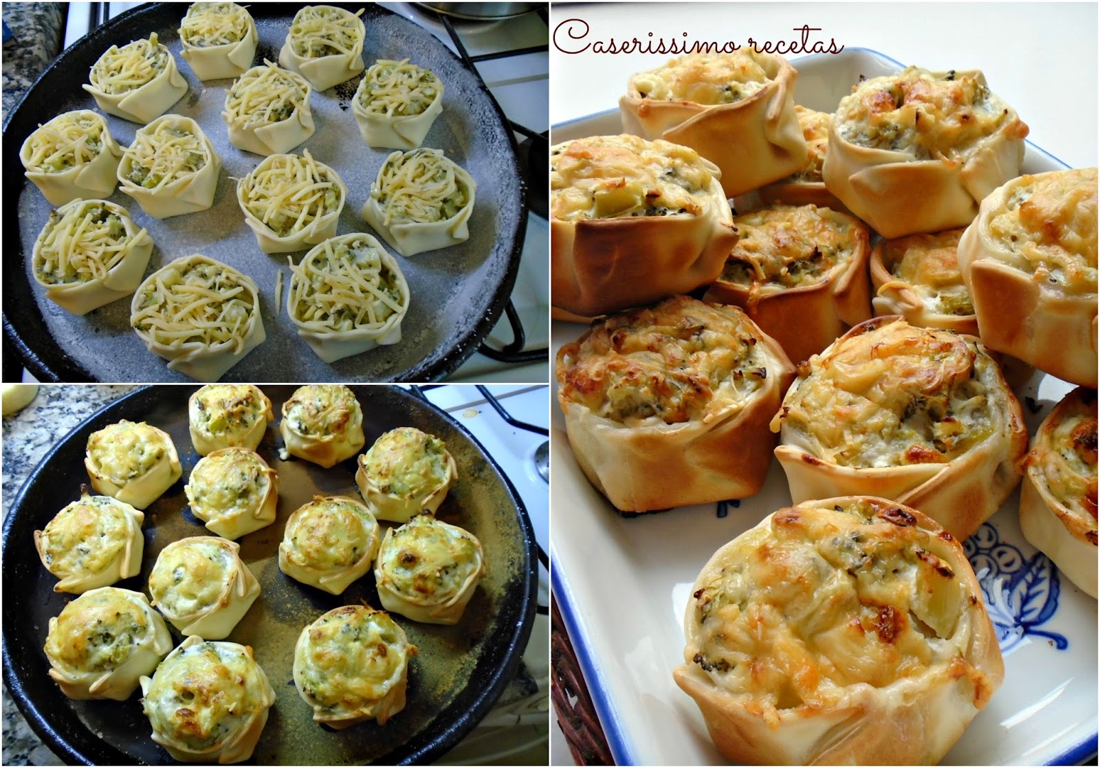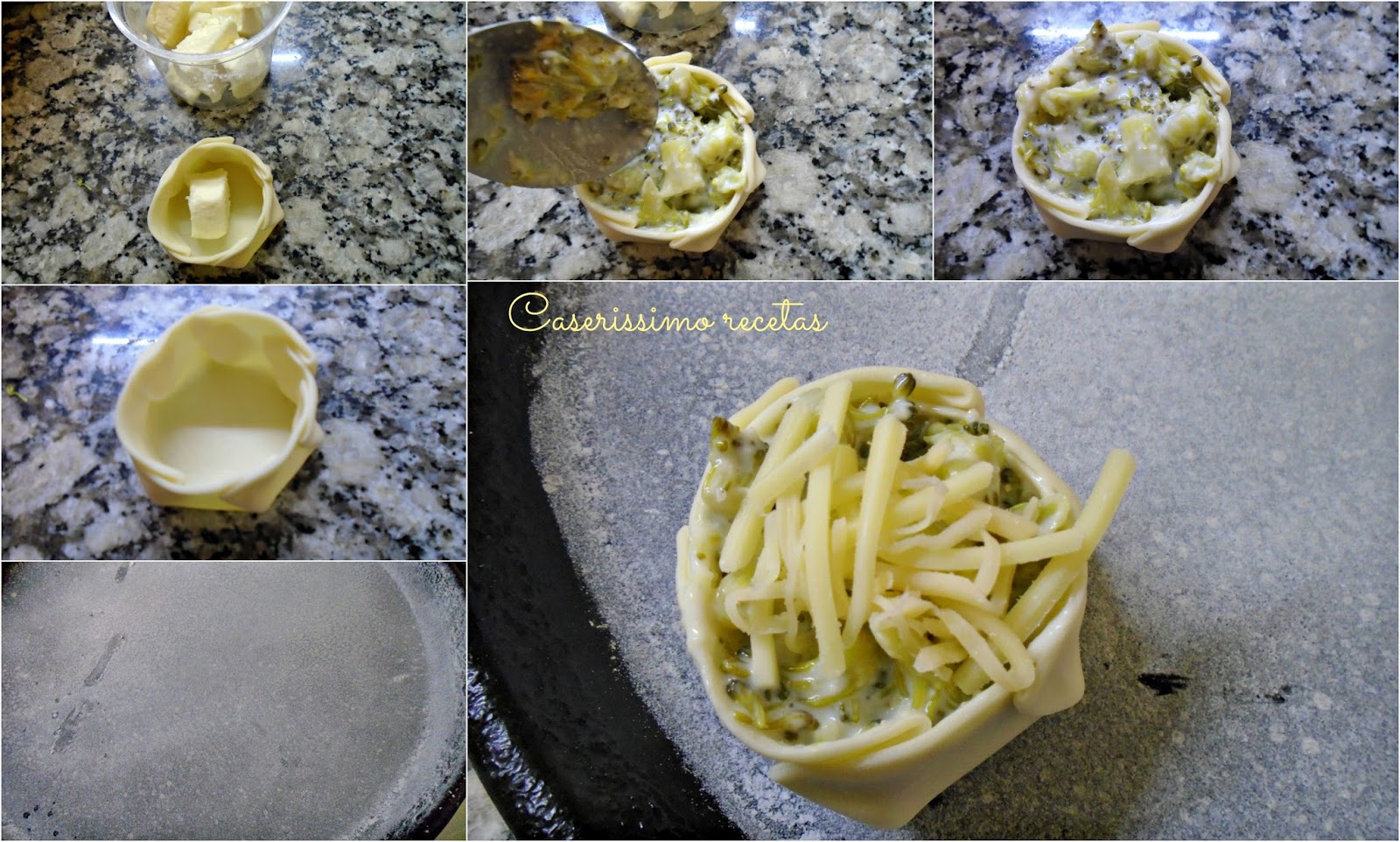 Para armarlas, una vez que hacen la canastita le ponen un trocito del tamaño de una moneda aproximadamente, de queso, luego dos cucharadas de la mezcla de brócoli y arriba unas hebras de queso.