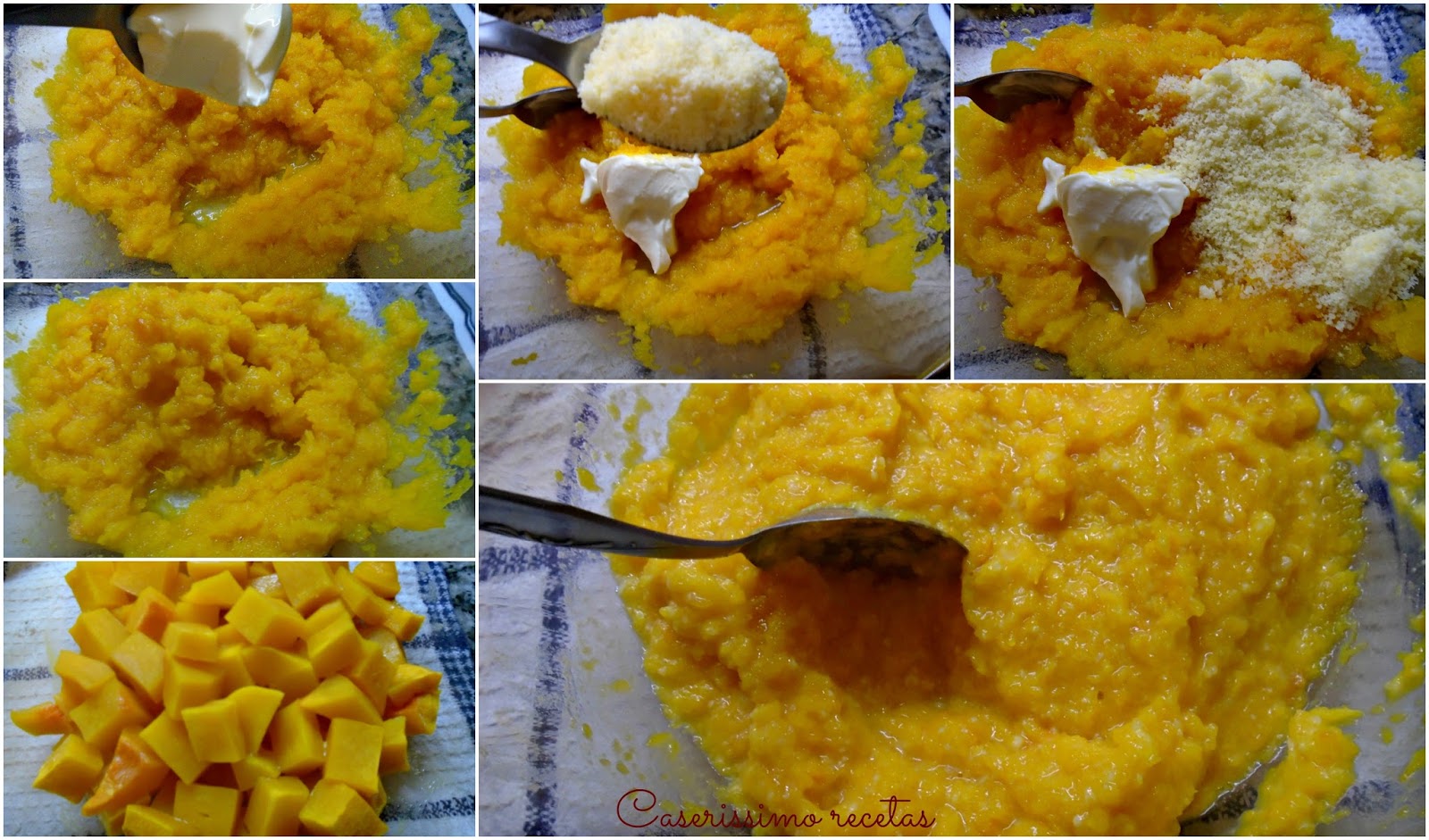 Pesamos una vez cocida, los 500 gramos, libre de agua, que no debe tener si está cocida de los modos descriptos. Hacemos un puré y le incorporamos el queso crema, la sal y el queso rallado. Mezclamos bien y reservamos.