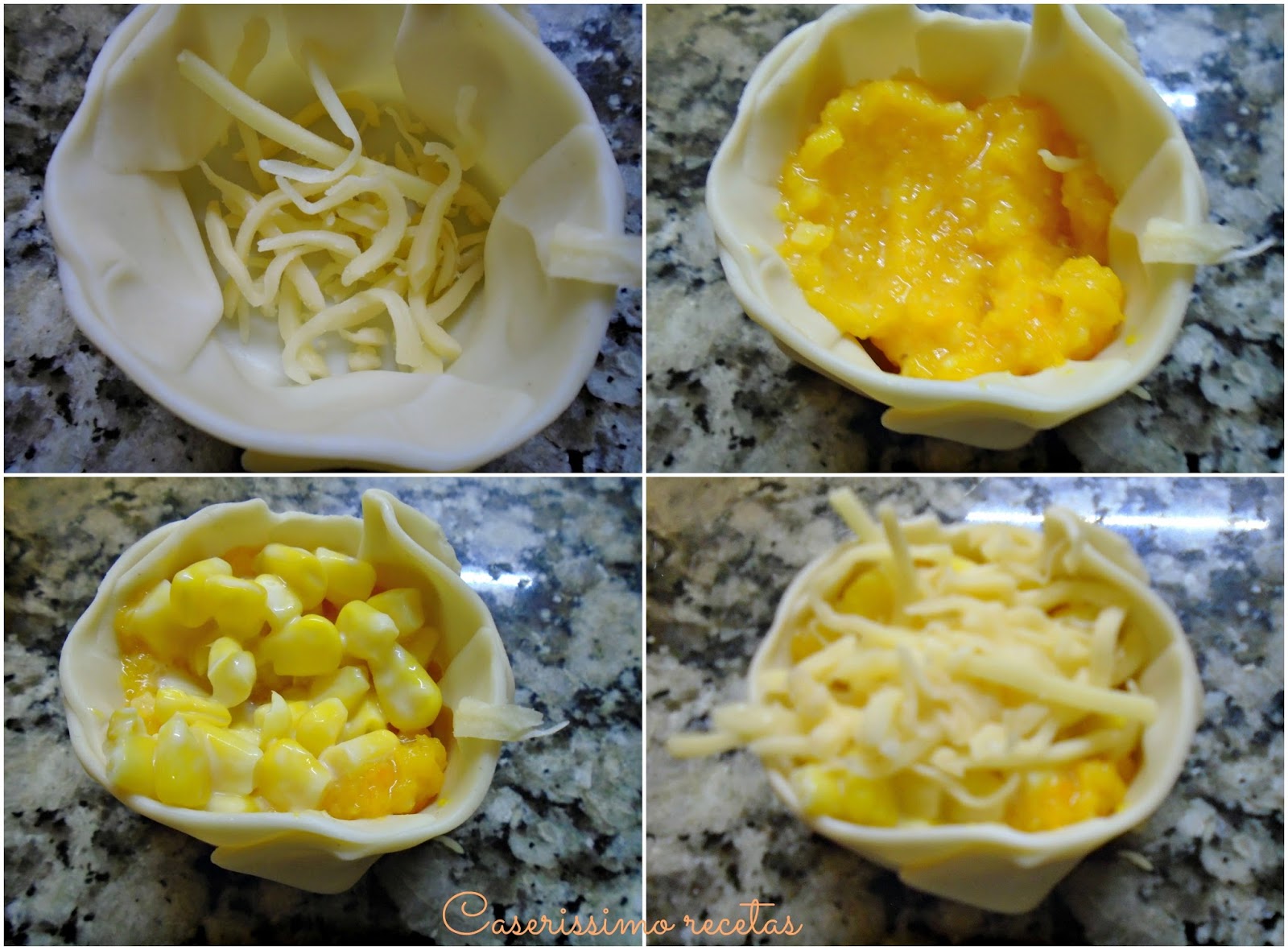 Para armar las canastitas conviene ir haciendo de a una. Si no saben como hacerlas AQUÍ les explico. Una vez que tienen una armada, le ponen un poquito de queso en hebras, una cucharada de puré de calabaza, una cucharada o un poco mas, de choclo y un poquito mas de queso en hebras.