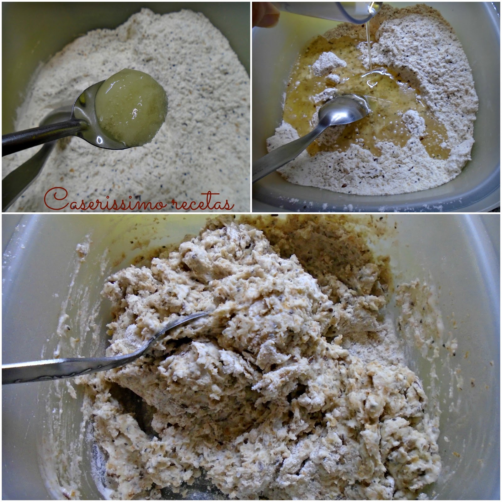 Agregamos la miel y el aceite, removemos un poco con cuchara y luego de a poco mientras removemos, vamos añadiendo el agua. Mezclamos con la cuchara hasta que ya no podamos, porque se endurece un poco. Ahora seguimos amasando con la mano. Amasamos por lo menos 2 minutos. Luego pasamos a la mesada enharinada. Seguimos amasando otros 3 minutos.