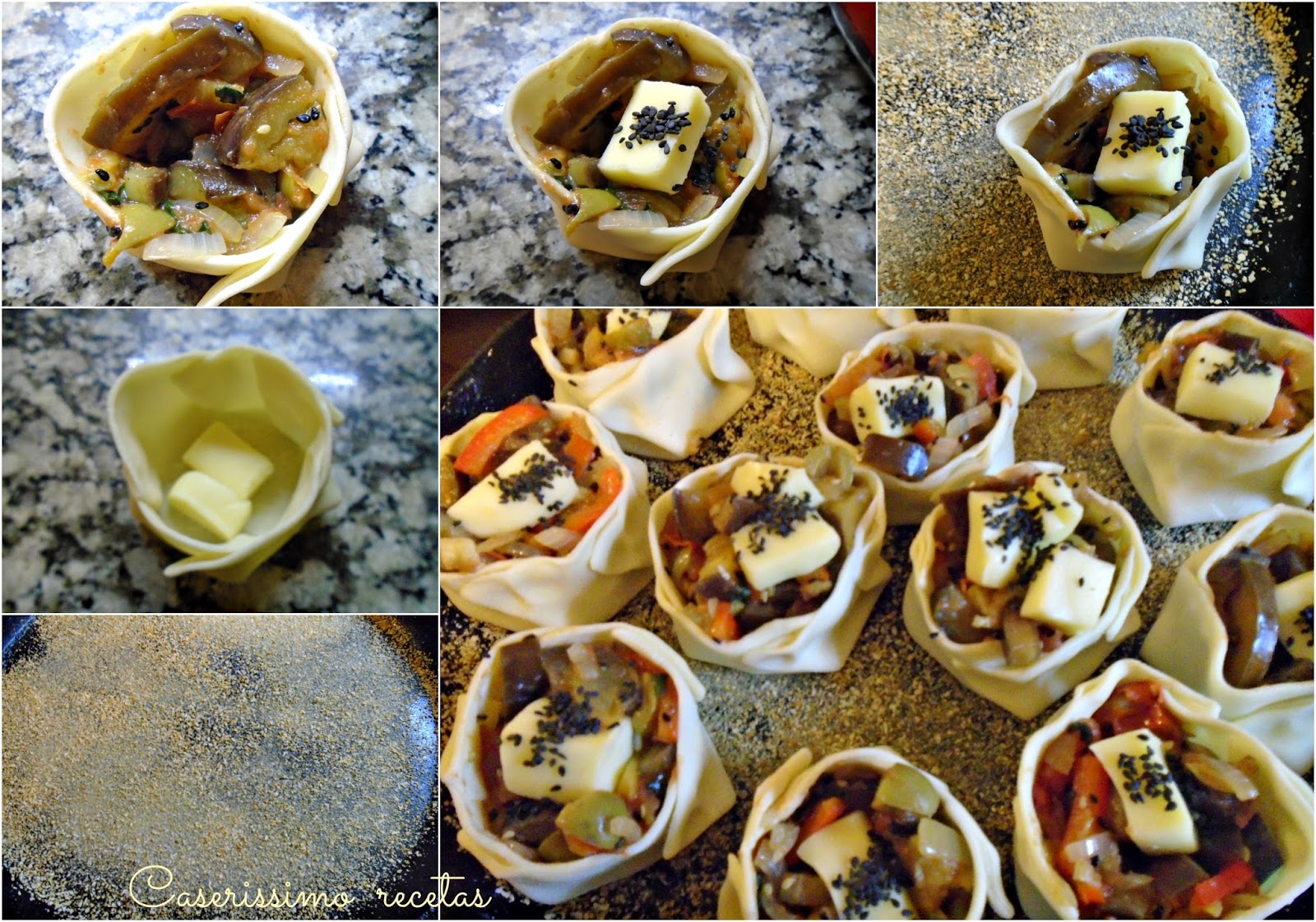 Un poco de sabores y listo!!! No son caras, llevan un poquito de cada cosa pero son productos básicos, salvo el aceite de sésamo que pueden obviarlo. Ah, y el detalle es que si usan masas compradas light, tienen 145 kcal. por canastita!!!!!! Vamos a la receta?