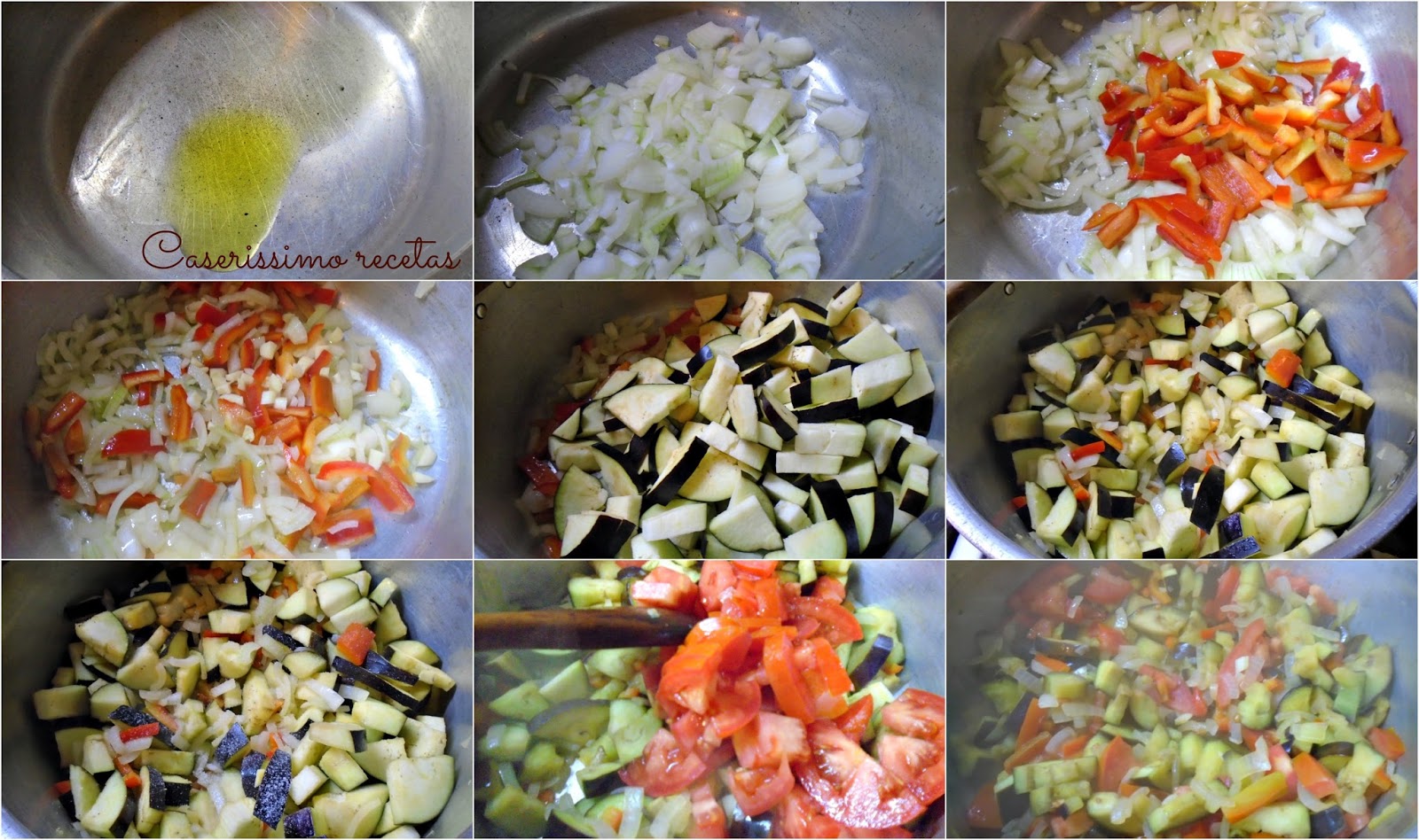 Colocamos el aceite de oliva en una sartén grande o cacerola amplia de base. Agregamos las cebollas, removemos un poco y agregamos el morrón. Removemos un poco mas y ahora las berenjenas. Removemos y dejamos dos minutos, removemos y añadimos sal fina y pimienta si les agrada. Removemos bien y le incorporamos el tomate. Removemos y dejamos dos o tres minutos mas. Debemos notar que los vegetales están blandos pero con firmeza interior, no totalmente blandos. Retiramos del fuego.