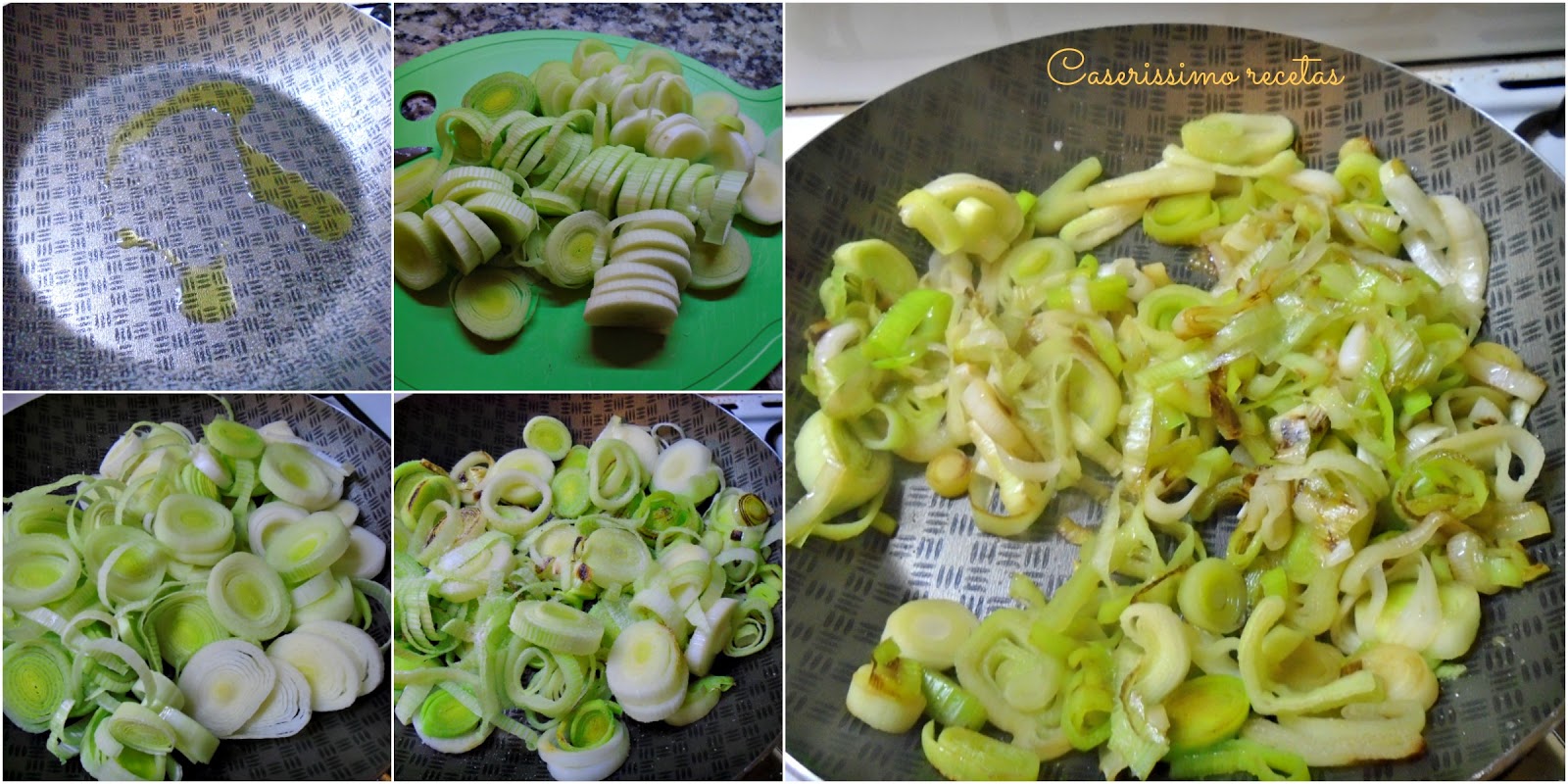 Lavar bien los puerros y cortarlos en rodajitas bien finitas. rehogarlo en un poco de fritolim, agregar azúcar, seguir hasta que dore apenas. Salar un poco y seguir en el fuego hasta ablandarlo. Retirar.