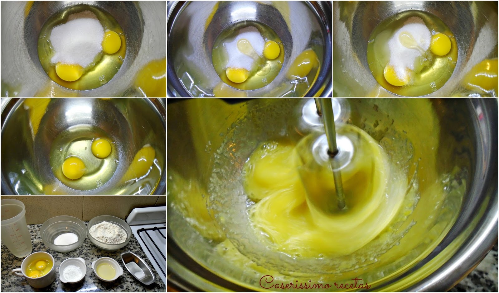 Colocamos en un bol los huevos, añadimos el azúcar, la miel y la sal. Batimos hasta espumar un poco. Agregamos en un principio 75 cc de agua y volvemos a batir hasta espumar mas.