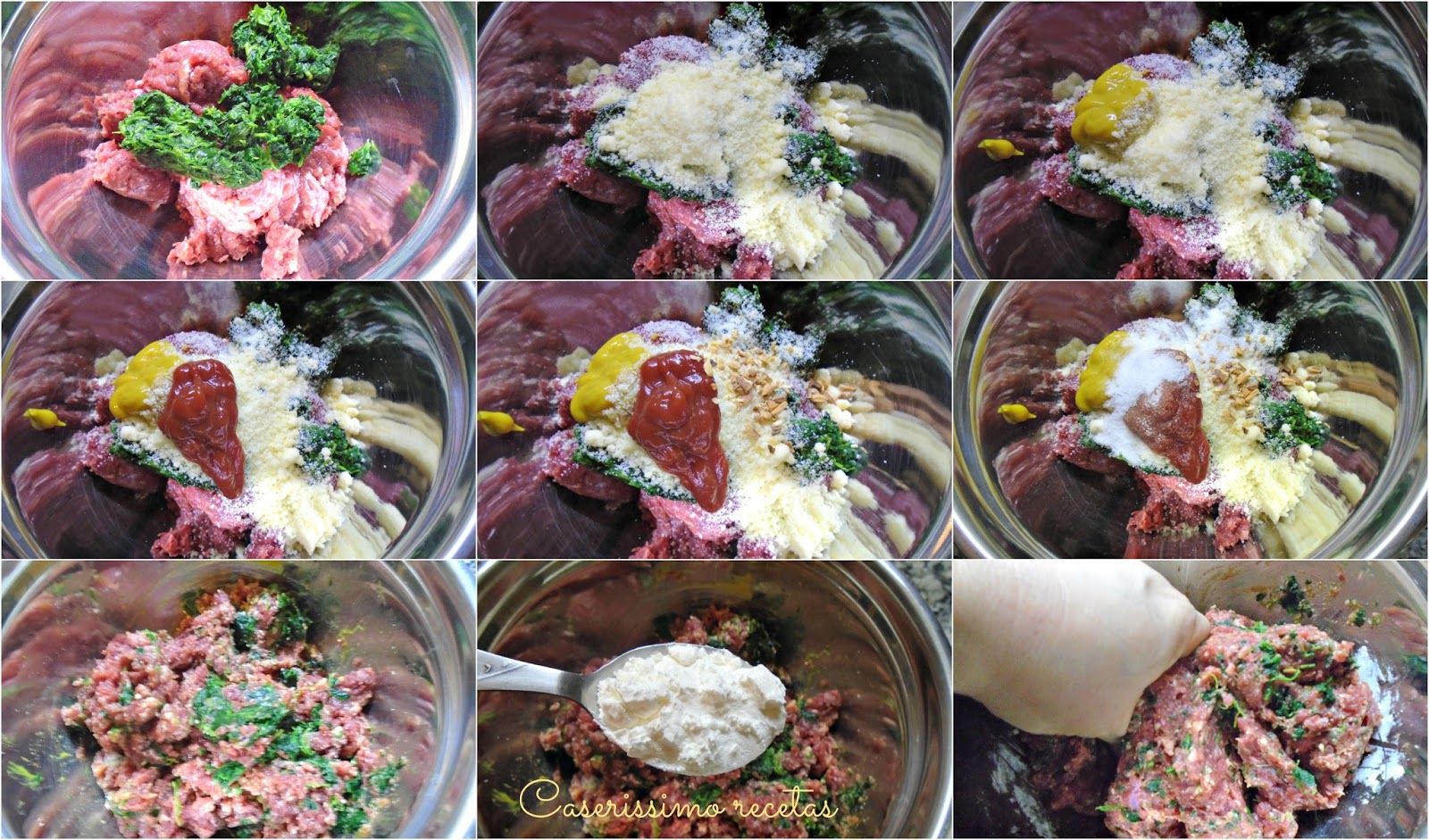 - Amasamos la mezcla durante al menos 4 o 5 minutos, de este modo el colágeno de la carne la aglutina y las hamburguesas no se desarman.