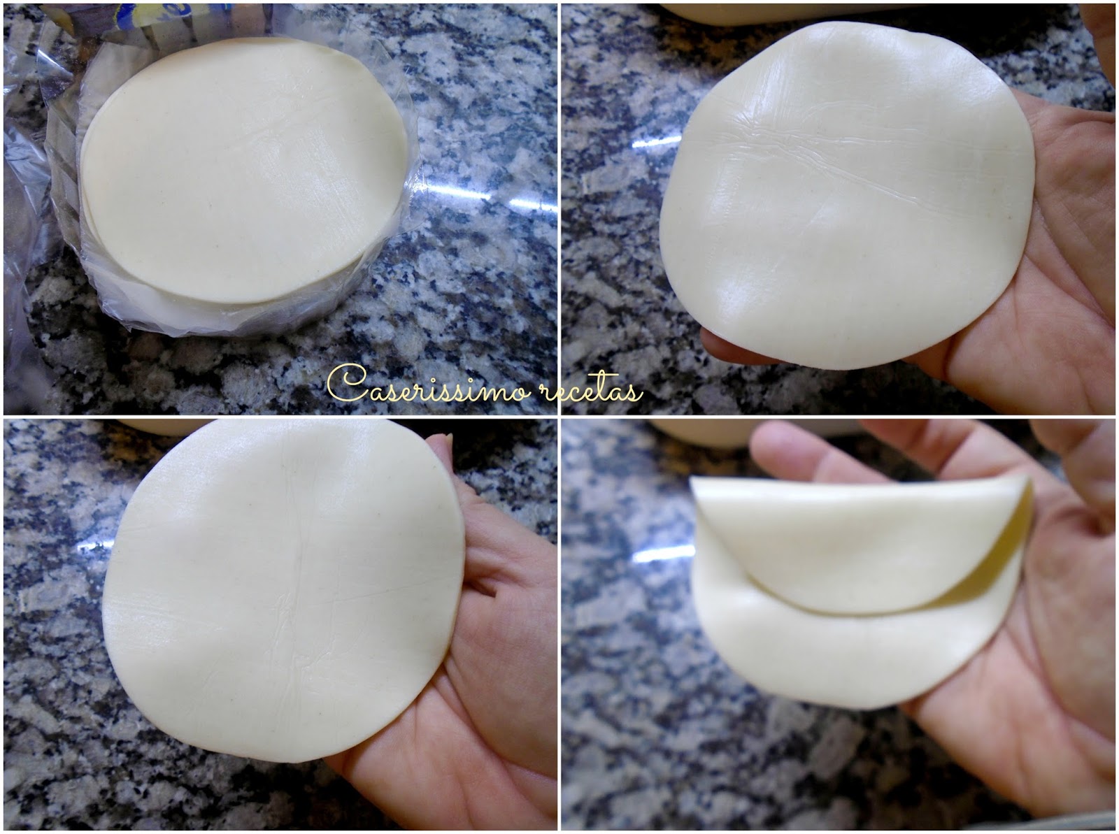 Vean estas fotos, yo quise mostrarles que hay un lado de las tapas que está mas brilloso y el otro mas opaco. Si usan el lado brilloso para adentro, no es necesario mojar el borde con agua porque tiene mas humedad. Si lo hacen del otro lado u observan que la masa está seca, mójenlo humedeciendo apenas la punta del dedo en agua.