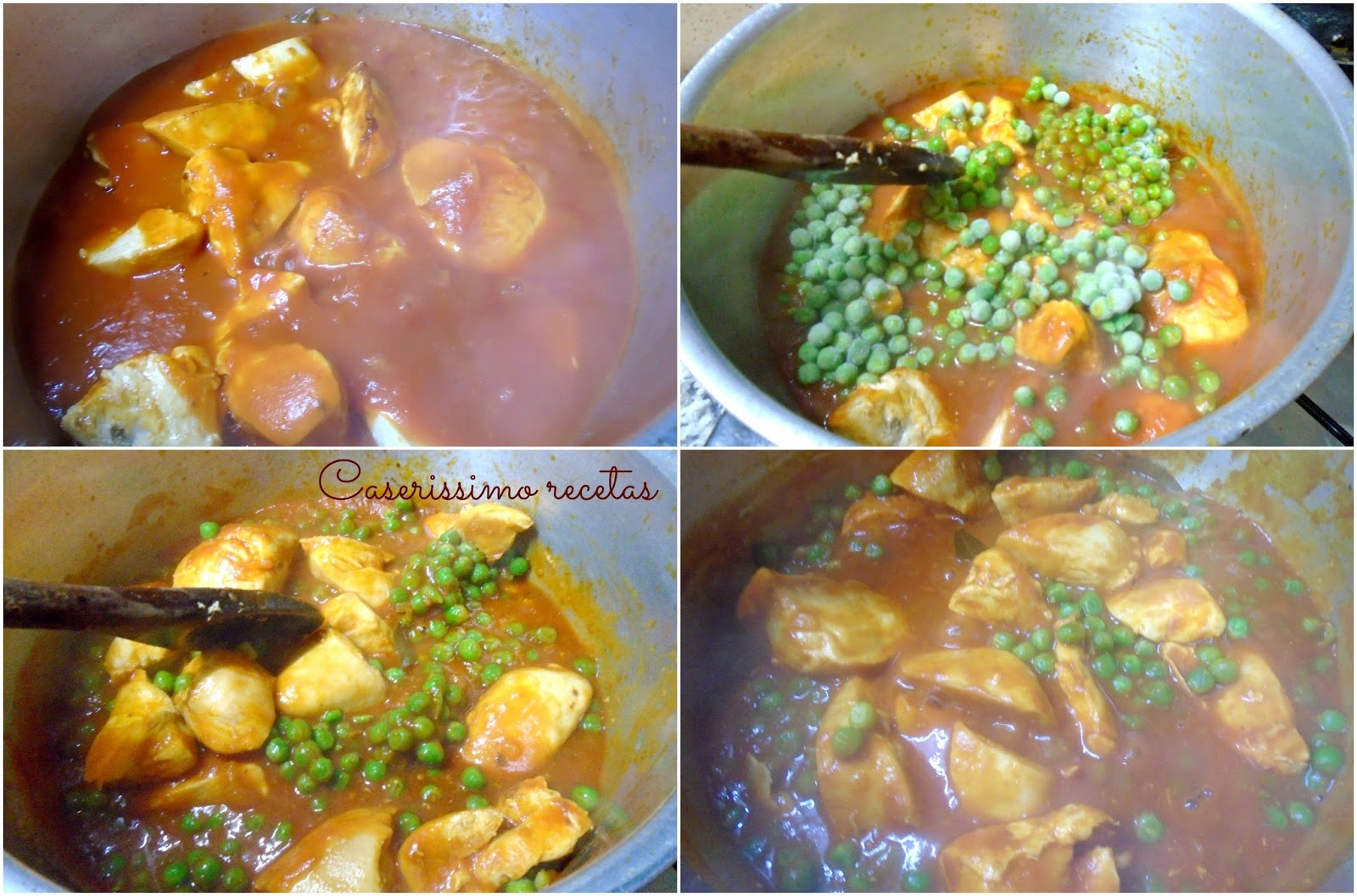 Si no vamos a usar vino, solo marcamos las supremas y luego vertemos la salsa sobre ellas. Incorporamos las arvejas. Bajamos el fuego, tapamos y dejamos cocinar 20 minutos controlando el líquido, en caso de ser necesario, añadimos un poquito (100 cc) de agua caliente.