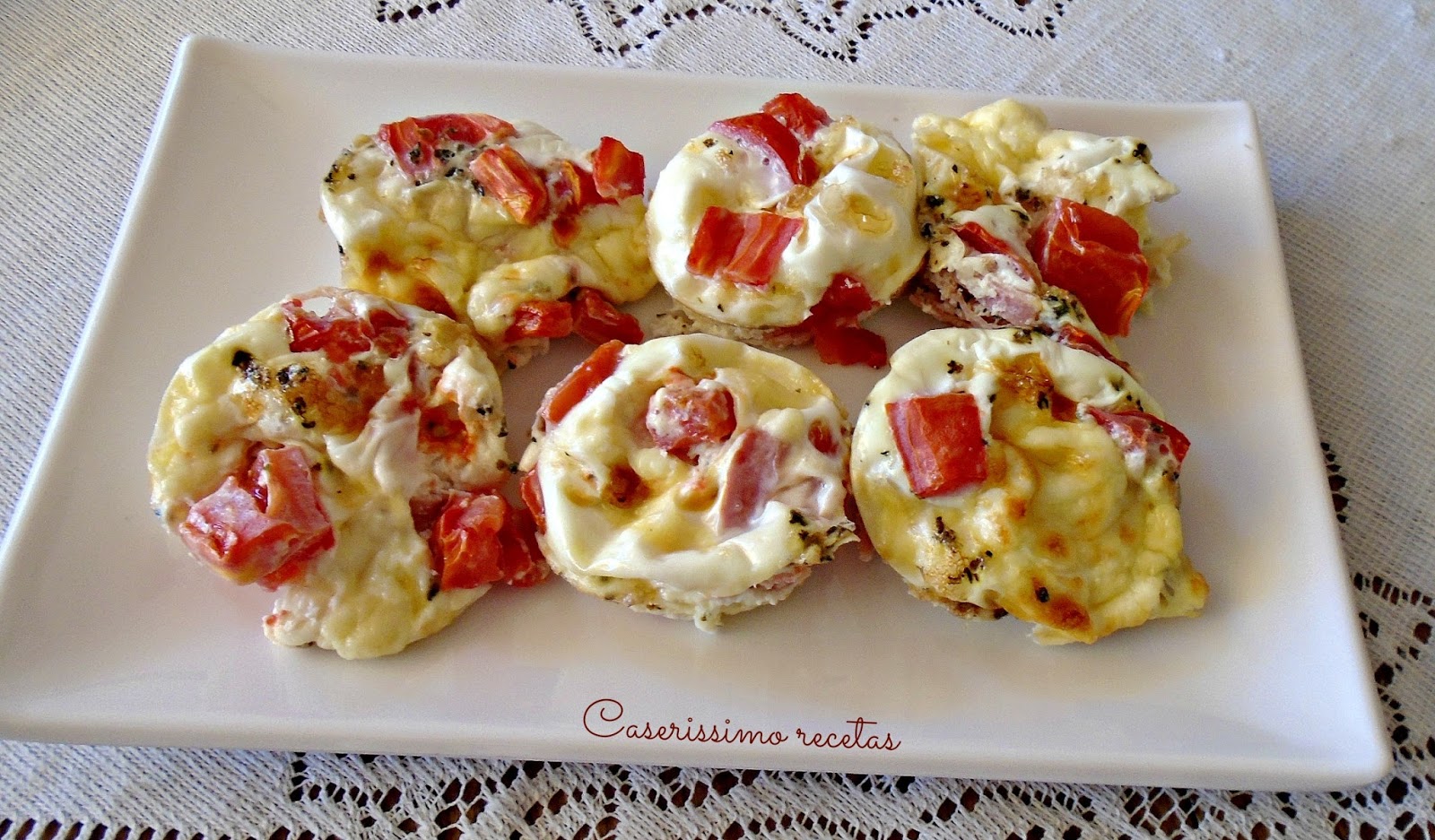 Dentro de cada molde ponen unos trocitos de jamón, 3 trocitos de queso o mozzarella y 3 o 4 trocitos de tomate, como se ve en la foto.