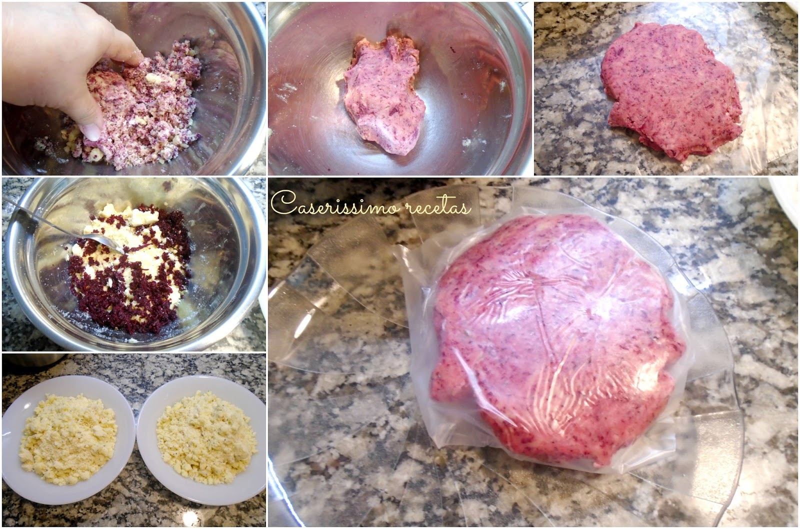 Separamos en dos platos la mezcla, a partes iguales. En dos boles distintos. A uno le añadimos la remolacha y la integramos procurando no amasar casi, pero sí que se integre bien y quede compacta. Cubrimos con film o separador y llevamos a la heladera.