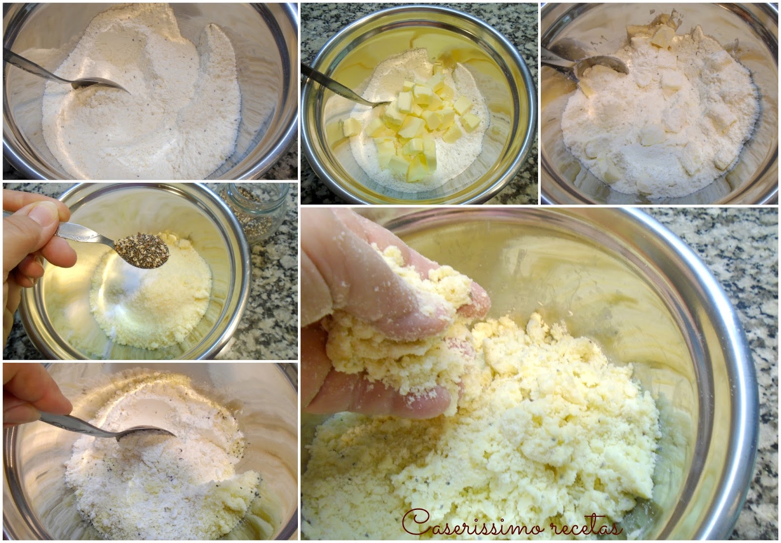 La desmenuzamos con las manos, en lo posible bien frías (podemos tocar hielo un ratito). Hacemos como una arena húmeda con los ingredientes hasta integrar bien la manteca. Debe ser hecho lo mas rápido posible eso, NO HAY QUE AMASAR PORQUE ENDURECE LA MASA.